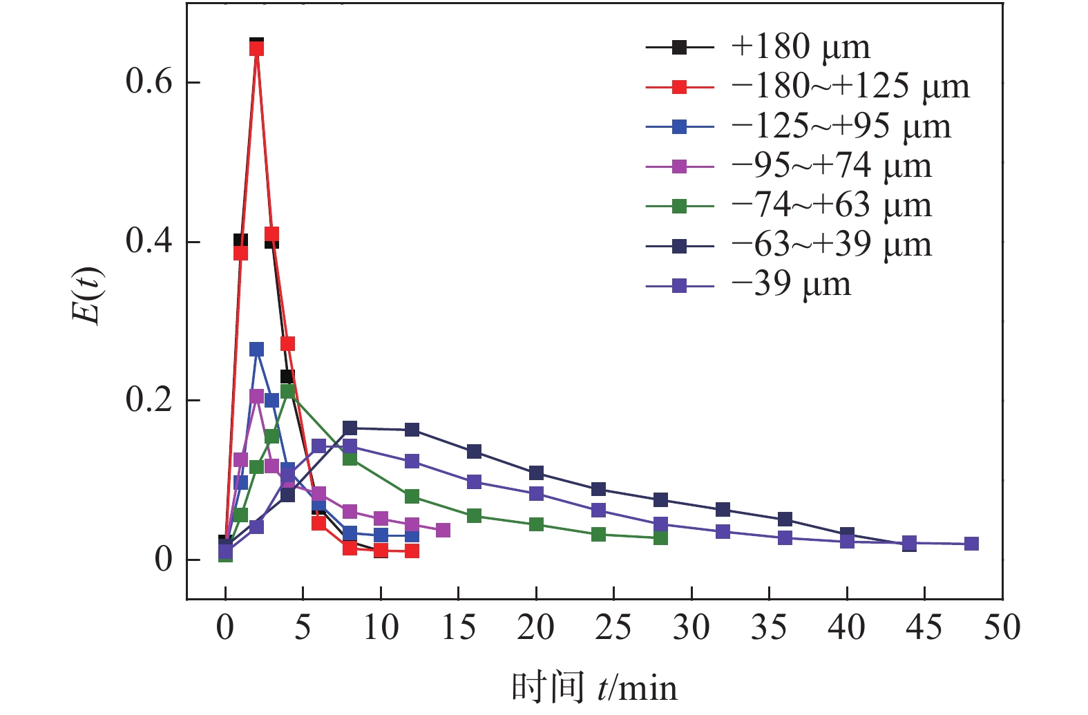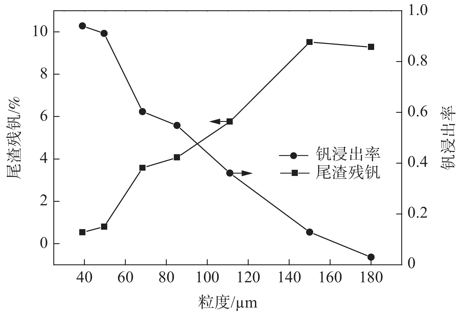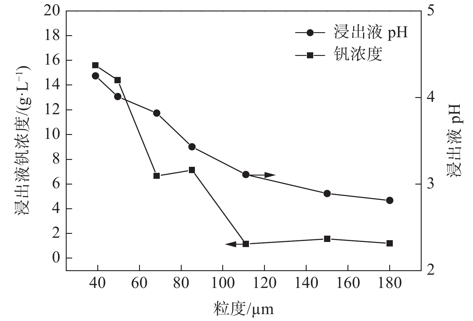 The fluidized leaching process of calcified vanadium slag clinker was studied in a particulate fluidized bed reactor. The particle size distribution of the clinker was determined and seven size fractions were divided for the experiments. The critical velocity and entrainment velocity of different size fractions were firstly calculated. The effects of clinker particle size on the apparent fluidization velocity, residence time and vanadium leaching rate were investigated. The results show that the critical fluidization velocity and residence time distribution of different particle size fractions are quite different, and there exists significant short circuit or channeling which needs to be treated by stages. The best vanadium leaching efficiency of 94% can be obtained for particles lower than 39 μm, with the residual vanadium content of the tailing at 0.54%.
