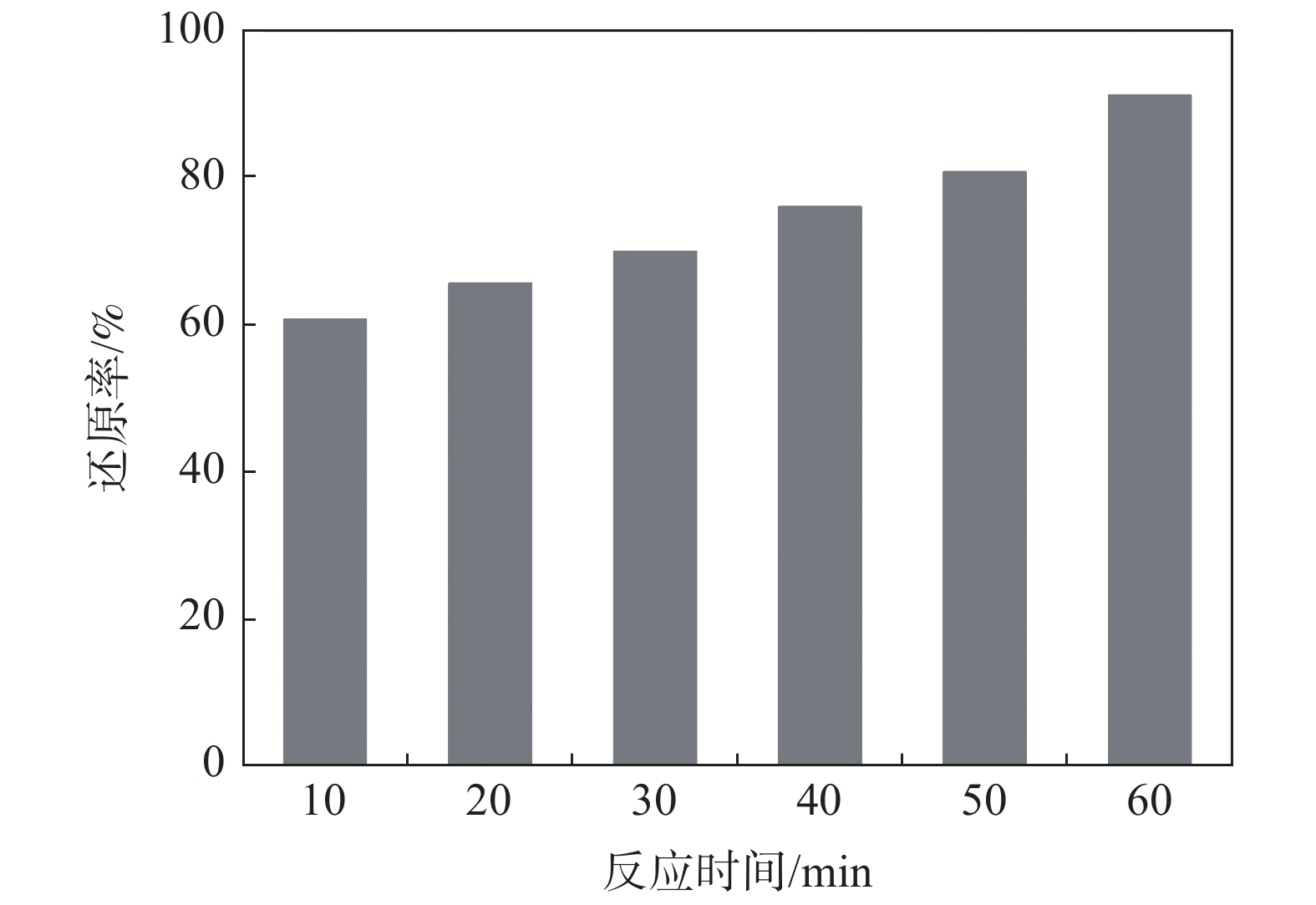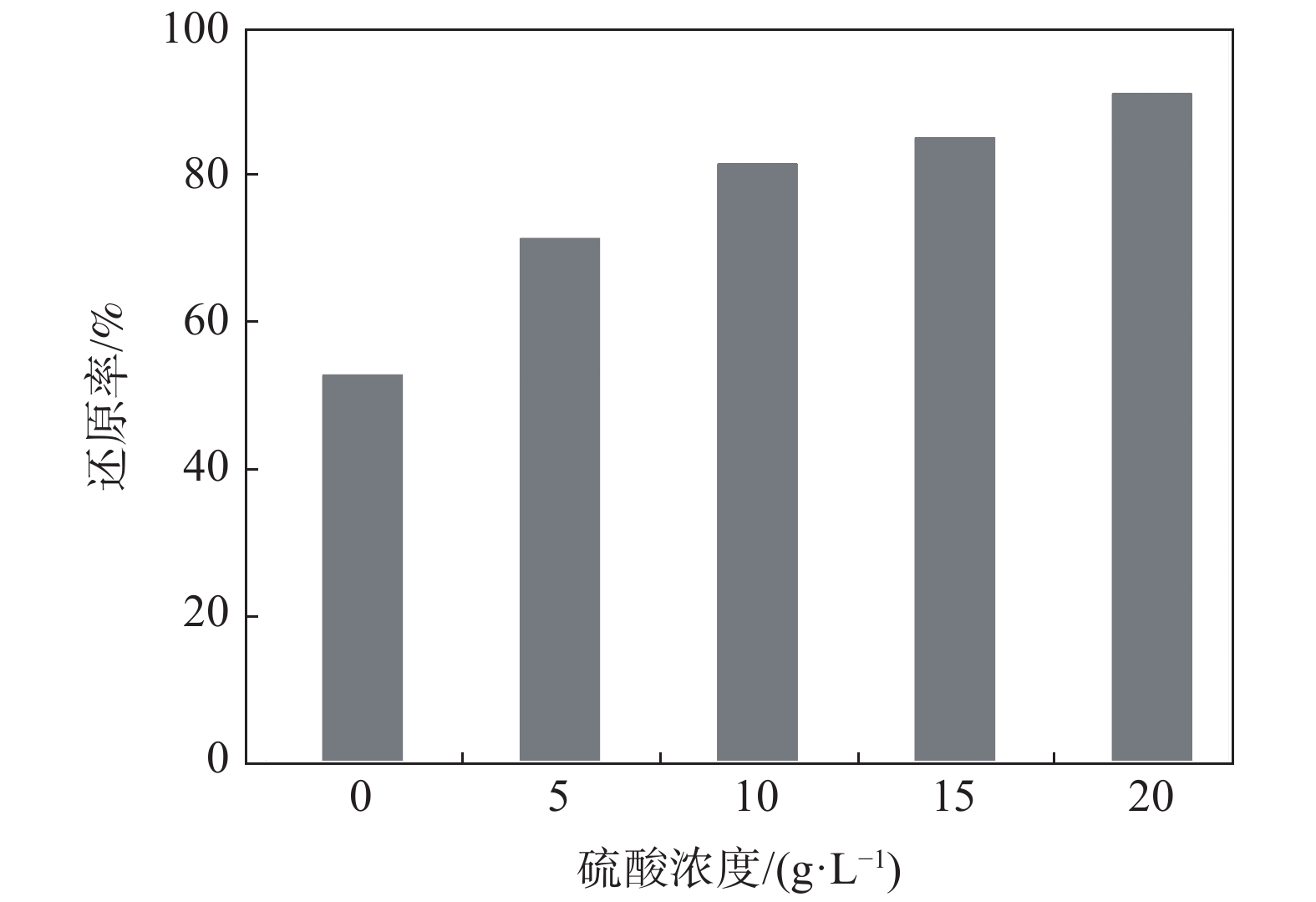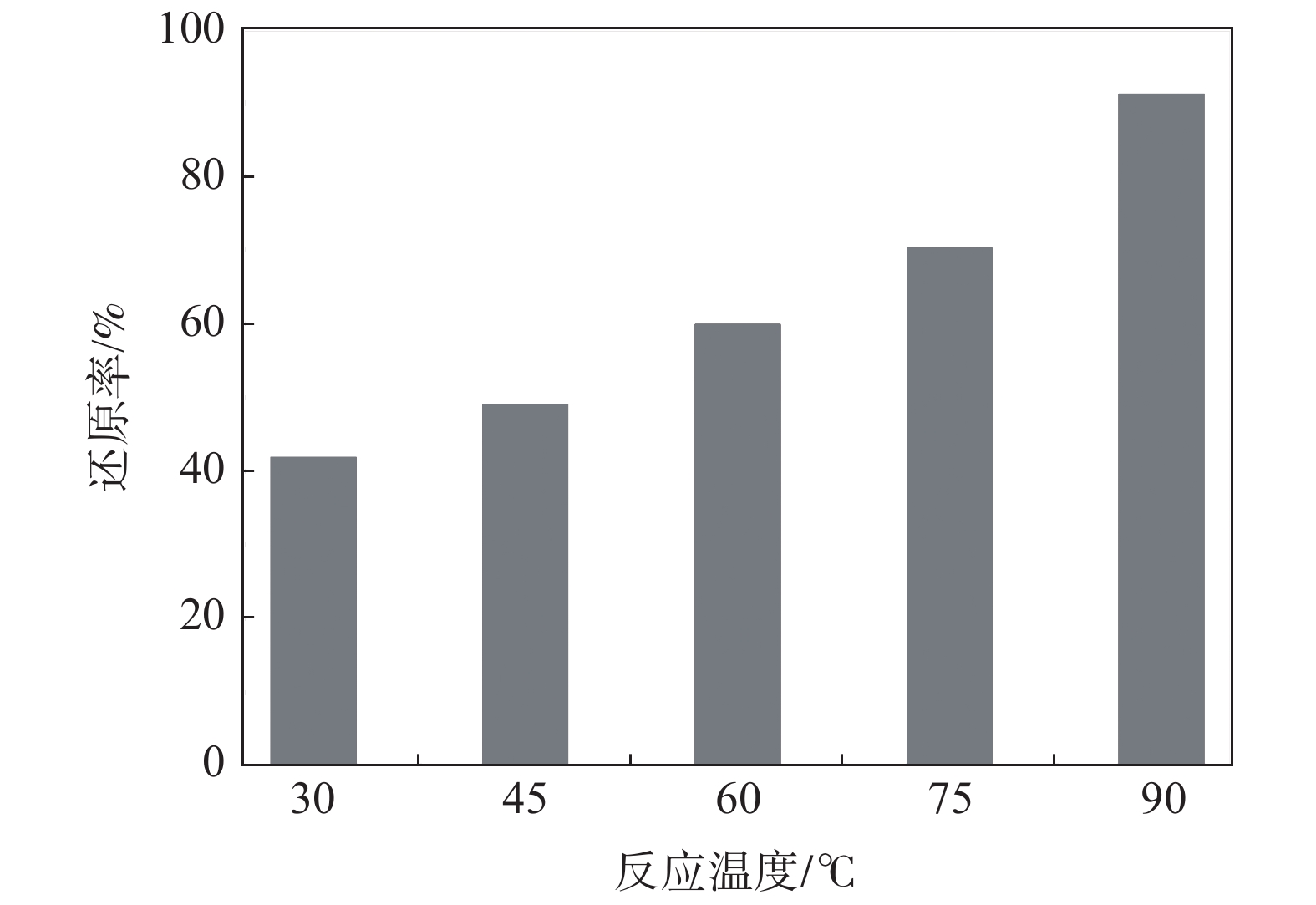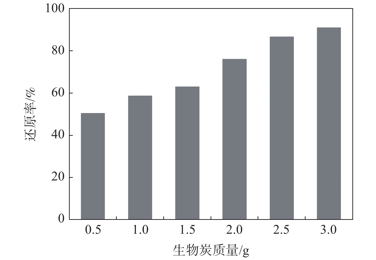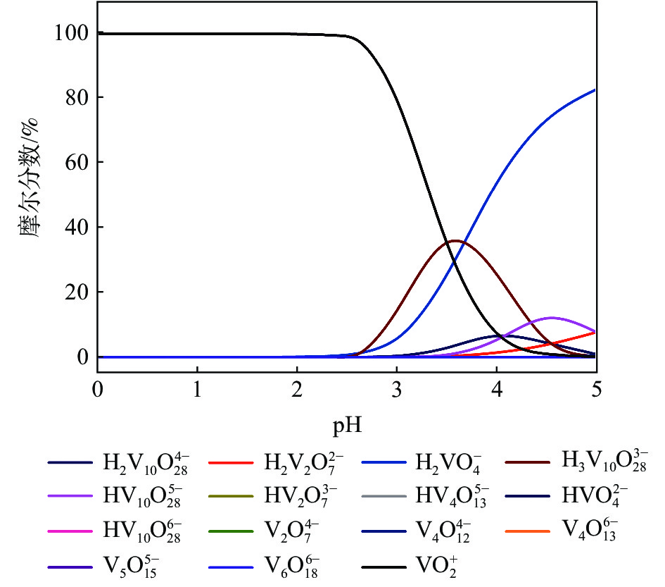 As the toxicity of vanadium increases with increase of the valence and it causes increasing threaten to the environment, biochar was introduced to do harmless treatment for high-valence vanadium. The effects of dosage of biochar, reaction temperature, concentration of H2SO4 and reaction time on the reduction efficiency of vanadium were investigated. The results indicate that pentavalent vanadium is mainly in the form of VO2+, H3V10O283? and H2VO4?, and it can be reduced quickly with biochar in acidic medium. The reduction efficiency of vanadium up to 92.14% can be obtained at the following optimal conditions: initial vanadium concentration of 3 g/L, biochar dosage of 3 g, reaction temperature of 90 ℃, reaction time of 60 min, H2SO4 concentration of 20 g/L and stirring rate of 500 r/min. During the reduction process, no impurities are introduced. Thus the technology can be applied to harmless treatment of vanadium and also has a great potential for production of low-valence vanadium compounds.