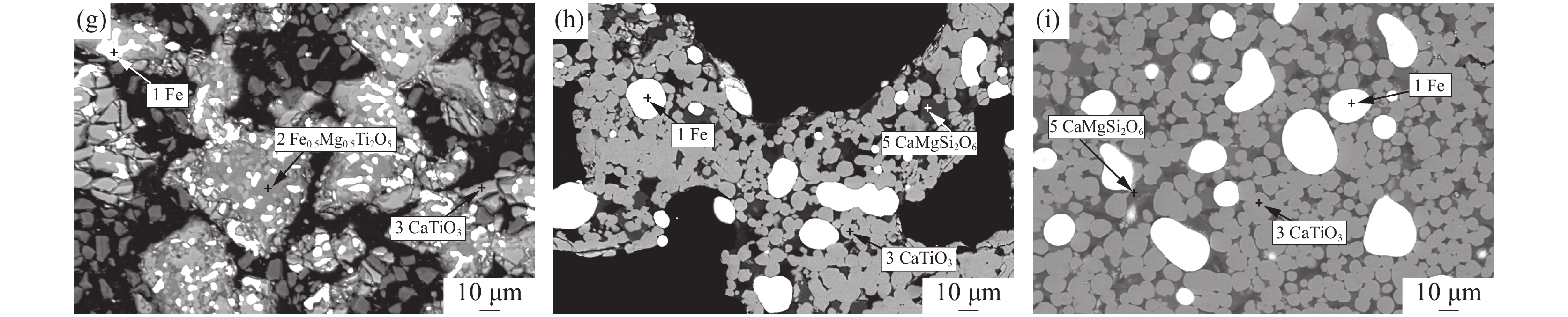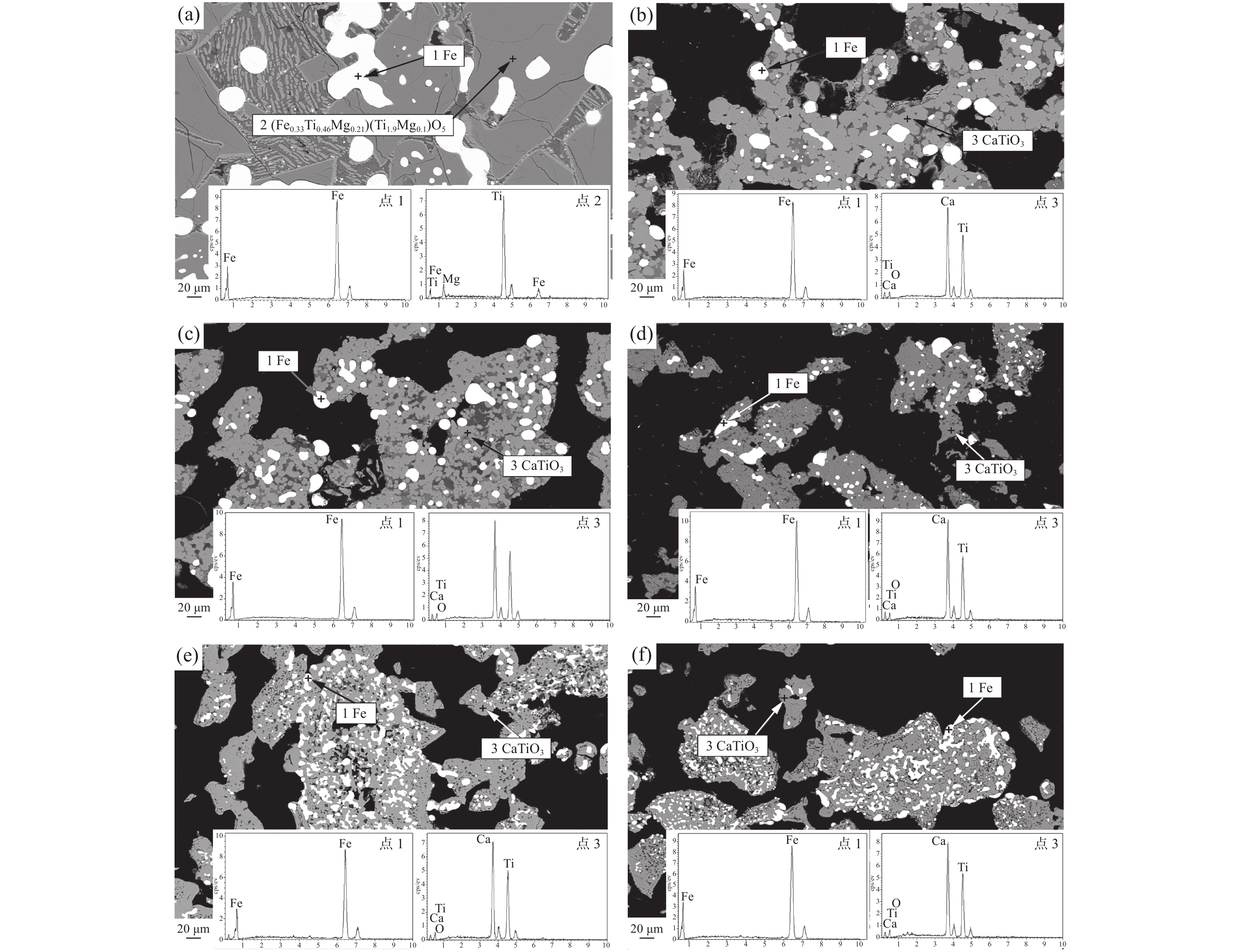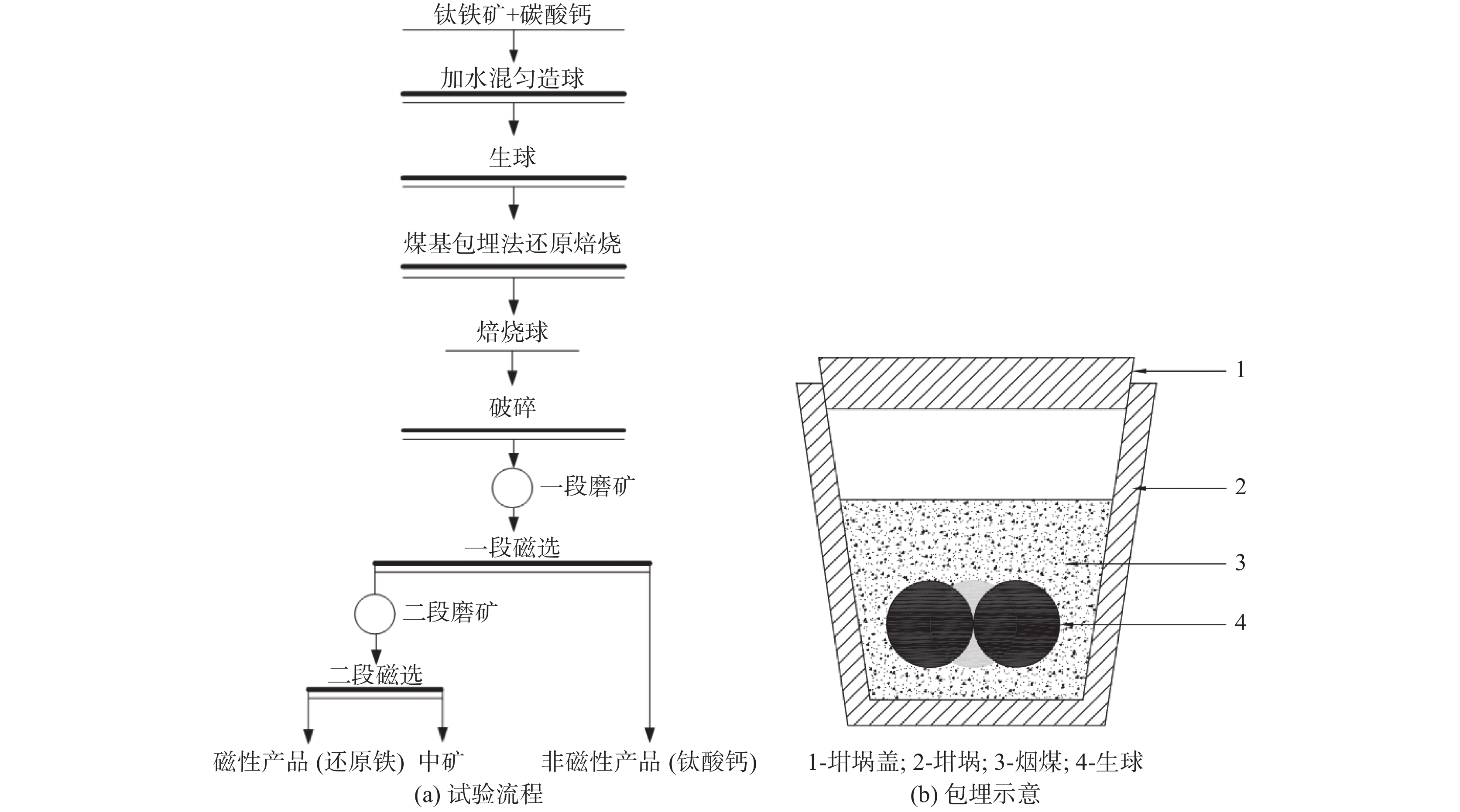 The paper studied the phase transformation of titanium and the formation mechanism of calcium titanate during the simultaneous preparation of calcium titanate by direct reduction of iron from ilmenite coal-based embedding method, and clarified the influence of additives such as calcium carbonate dosage and roasting temperature on reduced iron and titanium. The influence law and mechanism of calcium acid. The results show that the raw ilmenite pellets containing 60% calcium carbonate are roasted at a constant temperature of 1400 ℃ for 180 min by the coal-based embedding method, which can produce direct reduced iron while simultaneously producing titanium in the form of pure calcium titanate. Under the action of the additive calcium carbonate, when the calcination temperature is >1300 ℃, calcium titanate begins to be produced as the main titanium-containing phase, and the best calcination temperature obtained by the experiment is 1400 ℃. As the amount of calcium carbonate increases, the content of black titanite in the calcined product gradually decreases, and the content of calcium titanate gradually increases. However, the large amount of calcium carbonate causes the reduced iron particles to become finer, which is not conducive to the subsequent grinding and magnetic separation. Under laboratory conditions, the TFe grade of the reduced iron product is 81.86% and the recovery rate is 91.27%. The grade of Ti in the calcium titanate product is 26.95%, the content of calcium titanate is 76.37% and the recovery rate of titanium is 90.15%.