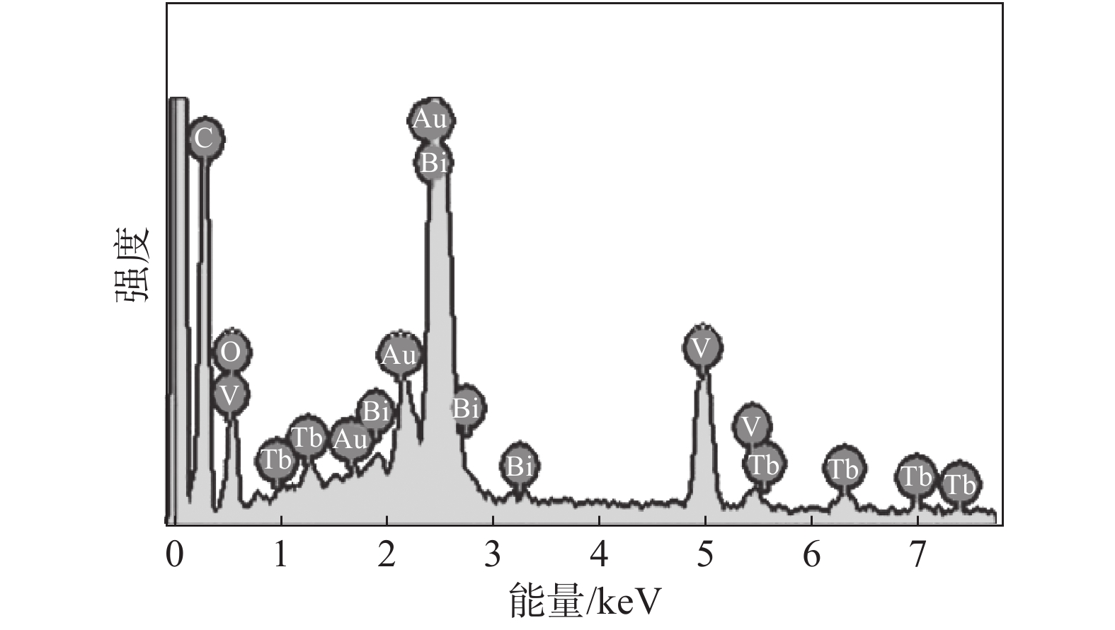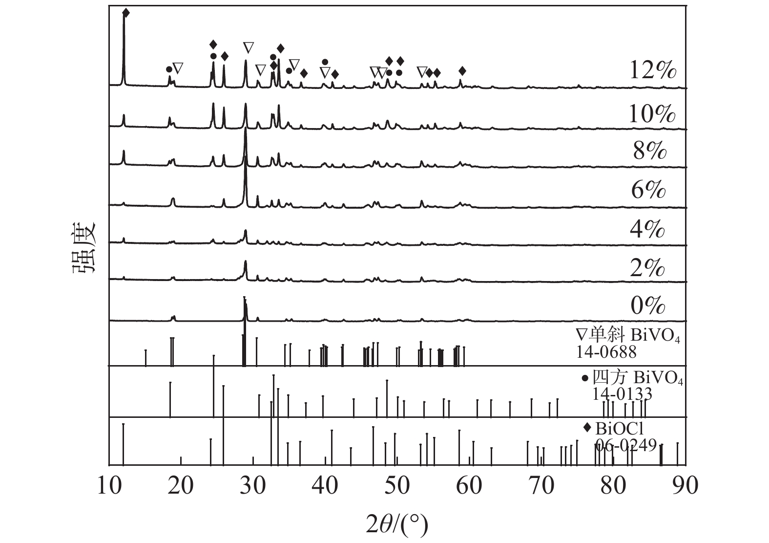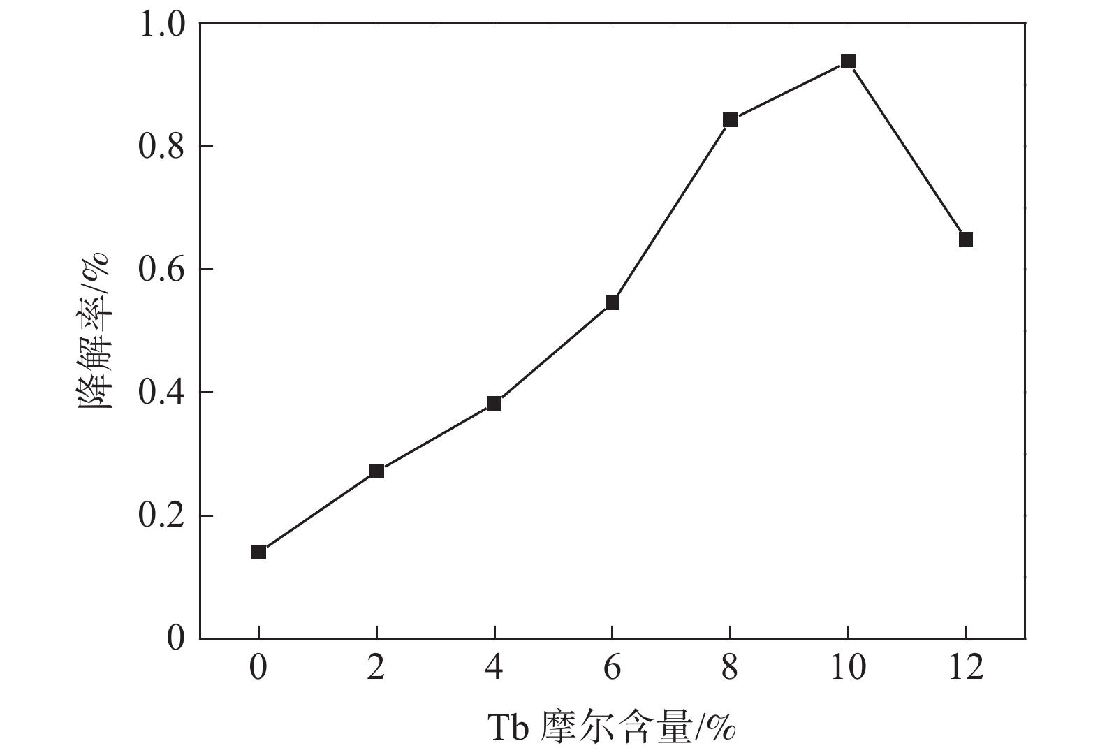 BiVO4/BiOCl composite photocatalysts with different contents of Tb were prepared by liquid phase precipitation method, and the catalysts were characterized by XRD and EDS. The photocatalytic performance of the photocatalysts was evaluated by degradation of rhodamine B under irradiation of the simulated sunlight. The effects of Tb content, photocatalytic time, catalyst dosage, rhodamine B concentration on the photodegradation efficiency of the samples were studied by single factor experiments, and the optimal scheme was determined by orthogonal tests. The results show that the pure BiVO4 belongs to monoclinic phase, and the samples with Tb content of 2% and 4% are mixture of monoclinic BiVO4/BiOCl phases. The samples with Tb content of 6%~12% are mixture of monoclinic BiVO4/tetragonal BiVO4/BiOCl phases. It indicates that the introduction of Tb can promote the transformation of BiVO4 from monoclinic phase to tetragonal phase. Compared with that of the pure BiVO4, the photodegradation efficiency of all samples containing Tb is improved greatly, and the optimal molar fraction of Tb is 10%. At the rhodamine B concentration of 5 mg/L, the catalyst dosage of 25 mg, and the photocatalytic time of 2 h, the photodegradation efficiency of the sample with 10% Tb can reach 100%. The improved photocatalytic performance may be attributed to the electron capture effect of Tb and the formation of monoclinic BiVO4/tetragonal BiVO4/BiOCl miscible p-n heterostructures, which effectively improve the separation and transmission of photoinduced carriers and suppress the recombination of electron-hole pairs. It has great potential and application value in the treatment of polluted wastewater.