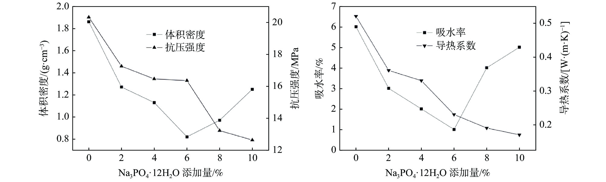 Foam glass-ceramics was prepared by one step sintering method at 900 ℃, using high titanium blast furnace slag and waste glass powder as the main raw materials, with calcium carbonate and borax as the foaming agent and fluxing agent, respectively. The effects of Na3PO4·12H2O on the foam glass-ceramics were investigated by DSC, XRD and SEM. The results show that the main phase compositions of the glass-ceramics, which include diopside Ca(Mg, Al)(Si, Al)2O6, iron-rich common pyroxene Ca(Mg, Fe)(Si, Fe)2O6 and common pyroxene CaMgSi2O6, change scarcely with the variation of Na3PO4·12H2O addition (0% to 10%, mass fraction). As the content of Na3PO4·12H2O increases, the compressive strength and thermal conductivity of the foam glass-ceramics decrease, while the bulk density and water absorption decrease first and then increase. At the Na3PO4·12H2O content of 6%, the foam glass-ceramics has the best comprehensive performances.