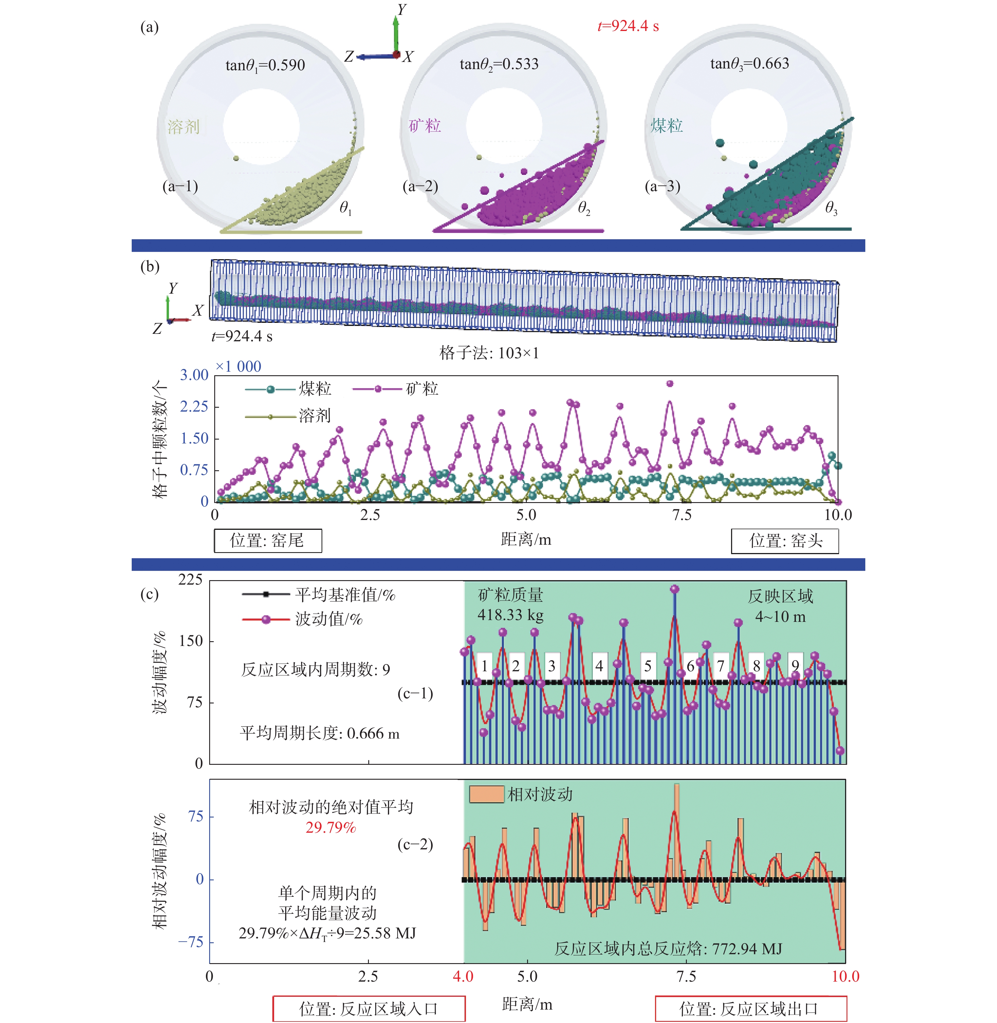 In this paper, the numerical simulation of on particle movement and pulverized coal injection combustion duringin the coal coal-based reduction of titano-magnetite pellets in rotary kiln was carried out. The results show that there were delamination phenomenon and discrete pile phenomenon in the movement process of three kinds of particles in rotary kiln. The discrete particle piles led to the axial periodic fluctuation distribution of particle number. Combined with the change of reaction enthalpy, the average fluctuation energy in a single period was deduced as $\tilde {{E}}$ = 25.58 MJ; in the process of pulverized coal injection combustion, the fuel jet would form a rebound effect under the action of gravity, and the length of the action zone was about 2 m. The mass and heat transfer process in this zone was strengthened, and the local overheating phenomenon was readily to occur. The energy fluctuation and local overheating could be reduced by the way of attaching carbon with coal powder on the surface of ore pellets and mixing carbon with external coal pellets. The amount of carbon distribution by adhering to ore particles is about 18.9 g/kg.