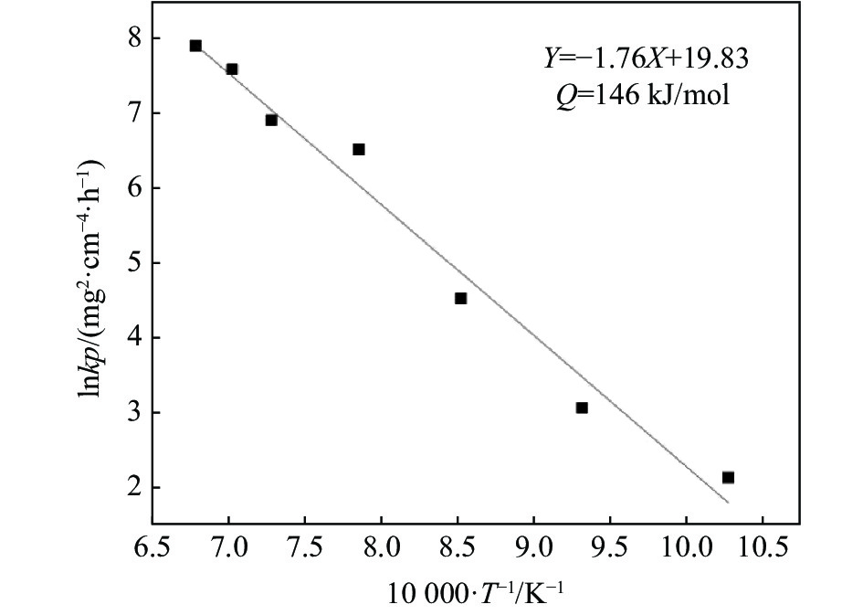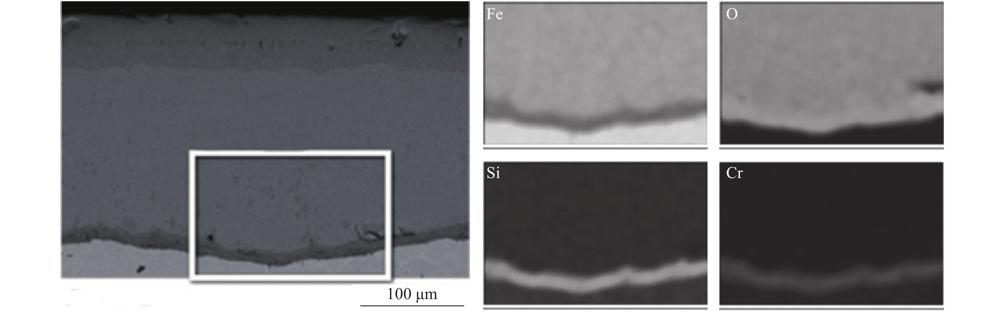 To clarify the high temperature oxidation behavior of weathering steel Q235NH containing Si and Cr, the oxidation experiment of weathering steel Q235NH was carried out at 700 ~ 1 200 ℃. The composition of iron oxide scale was analyzed by optical microscope (OM),scanning electron microscope (SEM), energy dispersive spectrometer (EDS) and X-ray diffraction (XRD). The evolution process of oxidation structure was analyzed by investigating oxidation kinetics curve. The results show that the iron oxide scale formation of Q235NH steel complies with the parabolic law, and its activation energy is 146 kJ/mol. The iron oxide scale structure consists of thin Fe2O3 and Fe3O4 layers in the outermost layer and thick FeO and massive proeutectoid Fe3O4 layers in the middle layer. In addition, when the heating temperature is lower than 1 100 ℃, a thin continuous silicon chromium rich layer will be formed between the scale and the substrate, which will hinder the outward diffusion of iron ions, making the oxidation more difficult. However, when the heating temperature is greater than 1100 ℃, the silicon chromium layer will be destroyed, which will promote the oxidation.