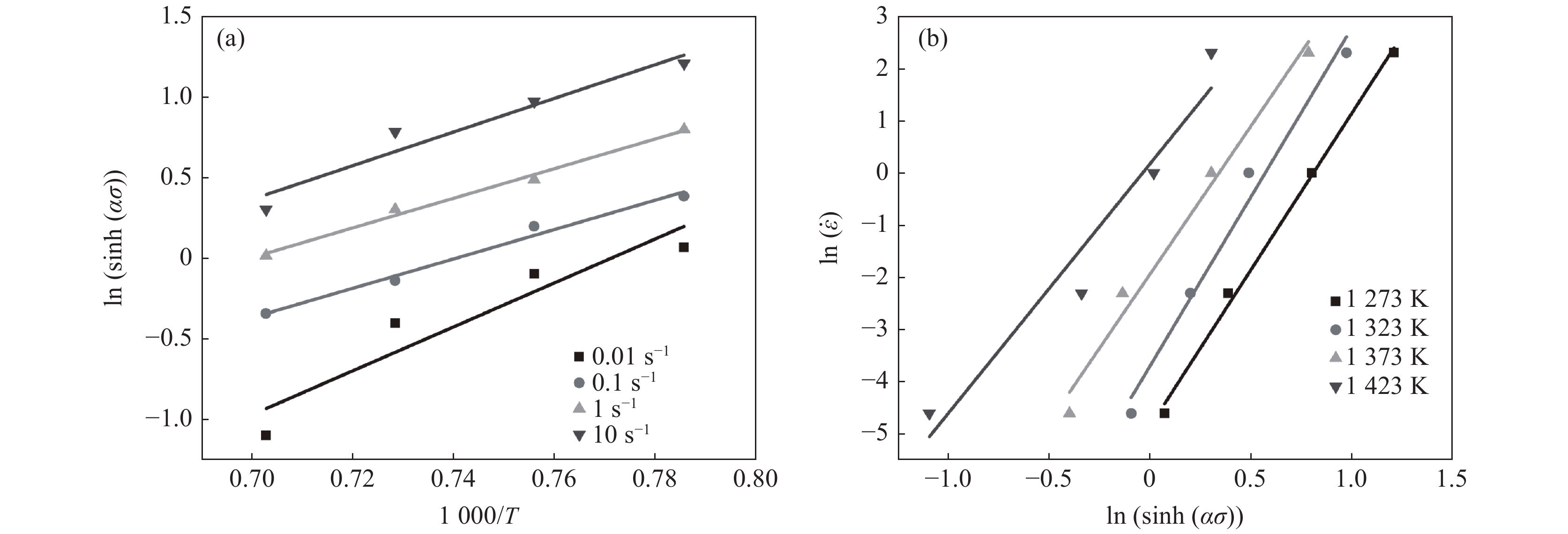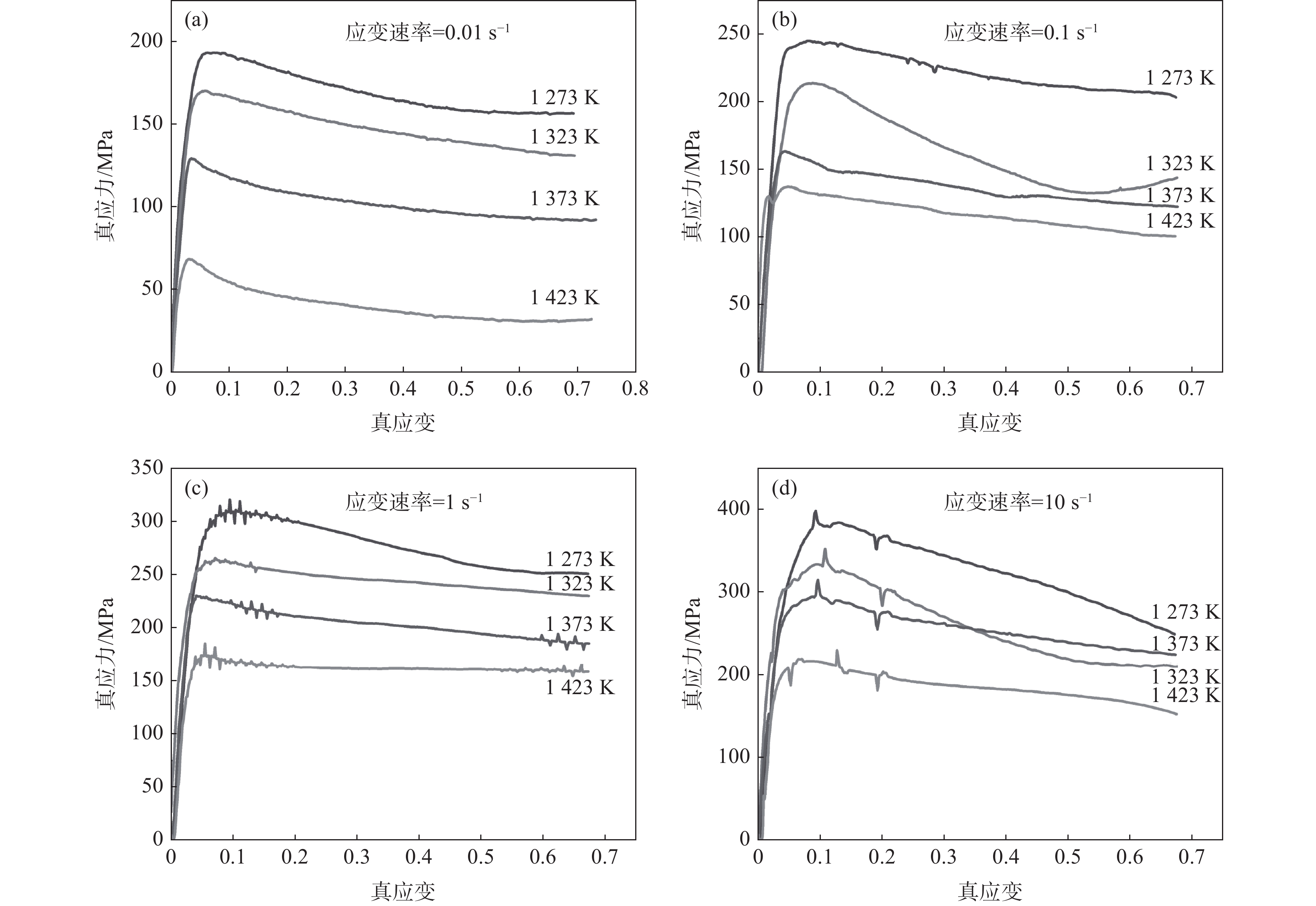 A Gleeble-3500 thermal simulation testing machine was used to conduct thermal compression experiments on electron beam melting M35 high speed steel. The hot deformation behavior under the conditions of deformation temperature of 1 273~1 423 K and strain rate of 0.01~10 s?1 was established. The evolution law of its carbide structure was studied, the thermal deformation constitutive equation of electron beam melting M35 high-speed steel, and the use of dynamic material model (DMM) to establish the electron beam melting M35 high speed steel hot processing map. At the same time, it is compared and analyzed with the hot deformation behavior of normal melting M35 high speed steel, The results show that the true stress-strain curve of electron beam melting M35 high speed steel conforms to the characteristics of dynamic recrystallization curve, the curve appears jagged at high strain rates, and the stress increases with the increase of strain rate and decrease of temperature. The deformation behavior in the hot deformation process can be characterized by a hyperbolic sine function, and its average activation energy is 504.642 kJ/mol. Through the hot processing map, the hot deformation instability area of M35 high-speed steel is intuitively displayed, and the best deformation conditions for hot working are obtained as follows: the deformation temperature is 1 400~1 423 K, and the strain rate is 0.01~1 s?1 .