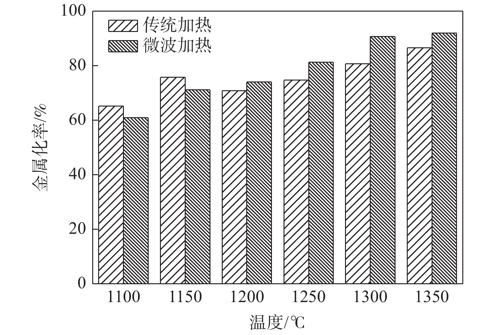 In this paper, the vanadium titano-magnetite concentrate was used as the raw material, and the influence of different heating methods on the reduction process was systematically compared based on the direct reduction process. The results show that compared with traditional heating, microwave heating can accelerate the reduction reaction of vanadium titano-magnetite, and the effect is more significant with the increase of temperature. At 1 350 ℃, the metallization rate of iron can reach 91.91%, increased by 5.32%. Microwave heating does not change the phase composition of the reduction product, but make the reduction product structure compact, less pores, coarse grains and uniform distribution. In addition, microwave heating can obviously remove the P element in the reduction product, but the removal effect of the S element is not significant. When heating temperature is 1350℃, P and S contents in resulted product for tranditional process are 0.077% and 0.29%, respectively, while for microwave process those values are 0.038% and 0.28%, respectively.