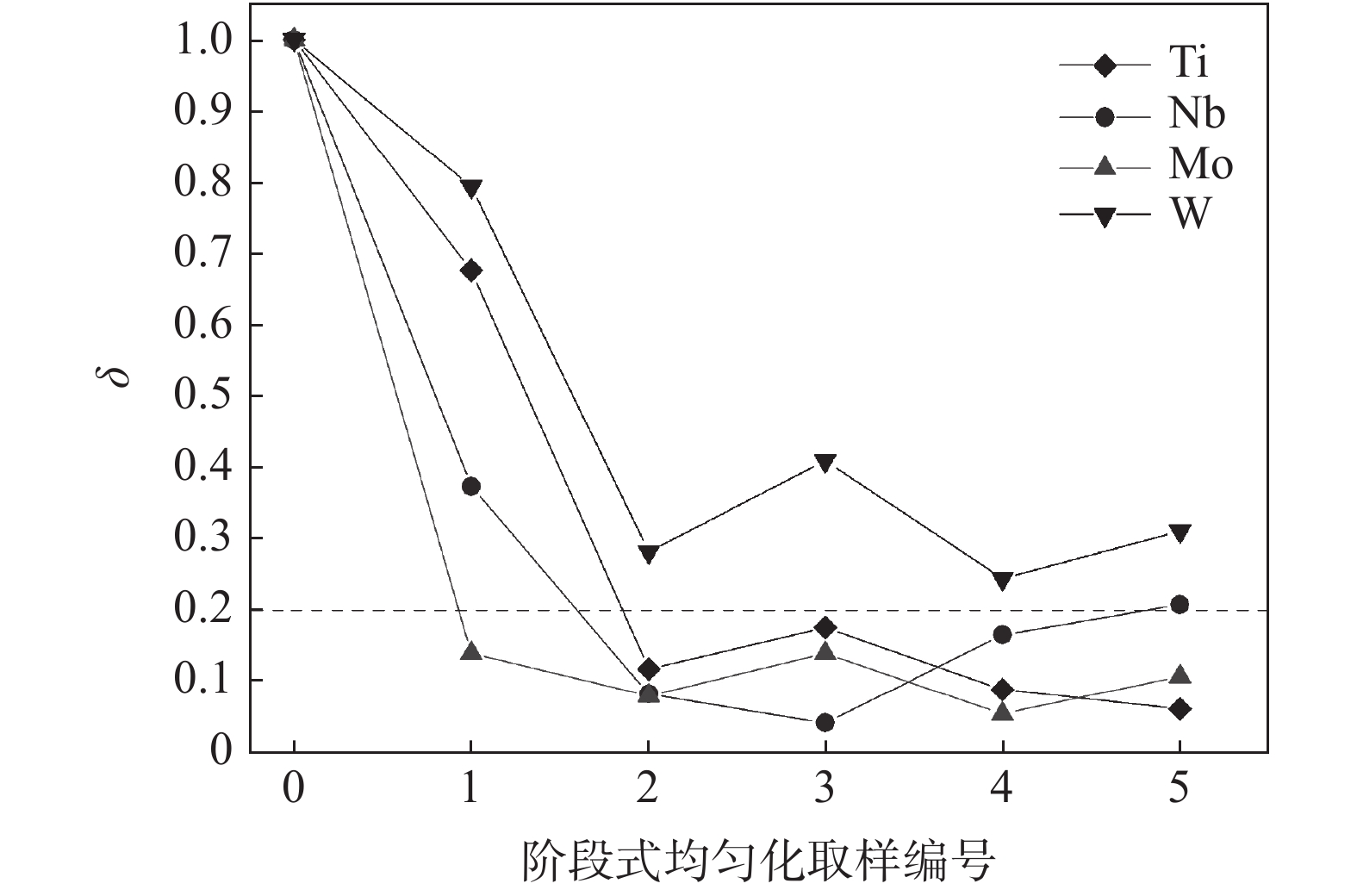 The as-cast microstructure of the samples from multiple locations of an ESR ingot of superalloy GH4065A had been characterised by SEM and DSC, and then evolution of microstructure and residual segregation index of the samples treated under a variety of designed homogenization schemes had been investigated. The results show that γ-γ’ eutectic phase, borides and TiN are the major precipitated phases in the as-cast microstructure of GH4065A. Ti, Nb, Mo and W are the major segregated elements. After homogenization at 1 160 ℃ for 10 h, the precipitated phases mostly dissolves and residual segregation index of Ti, Nb, Mo reduces down to about 0.2, and index of W down to 0.4, which demonstrates homogenization at 1 160 ℃ for 10 h is reasonable treatment condition. Due to the large scale of ingots in industrial production, it is acceptable to immerse the ingot in the furnace of 1 160 ℃ for 20 h to achieve homogenization.