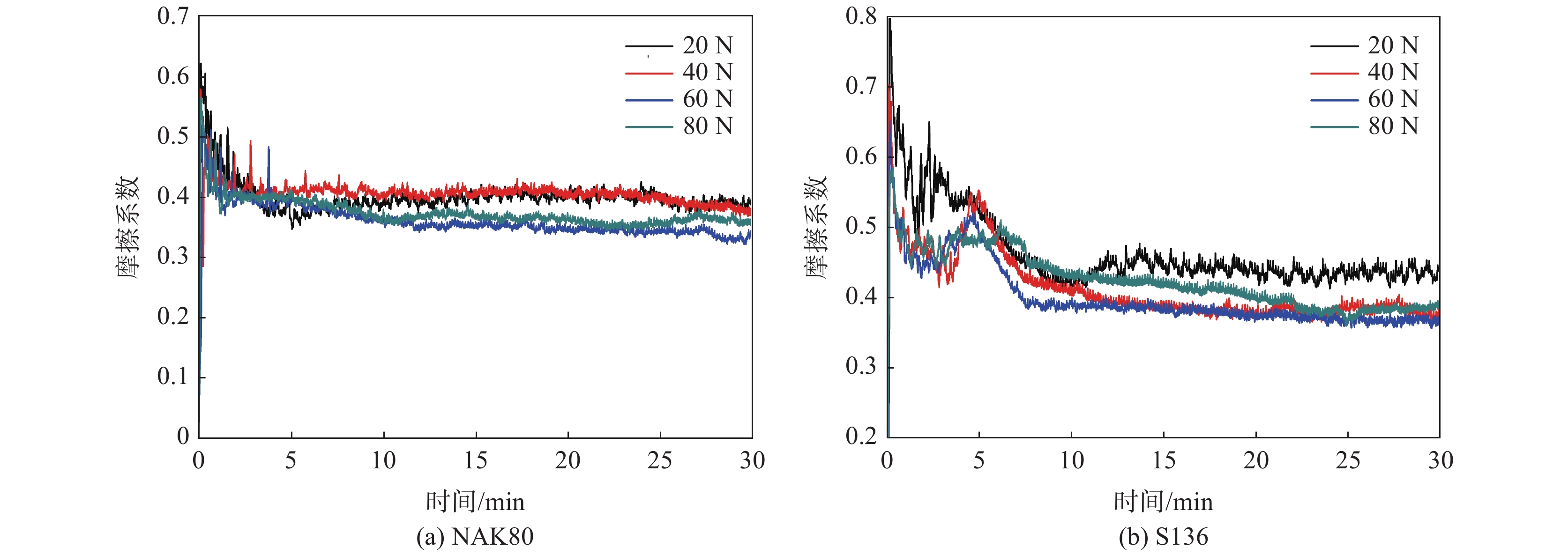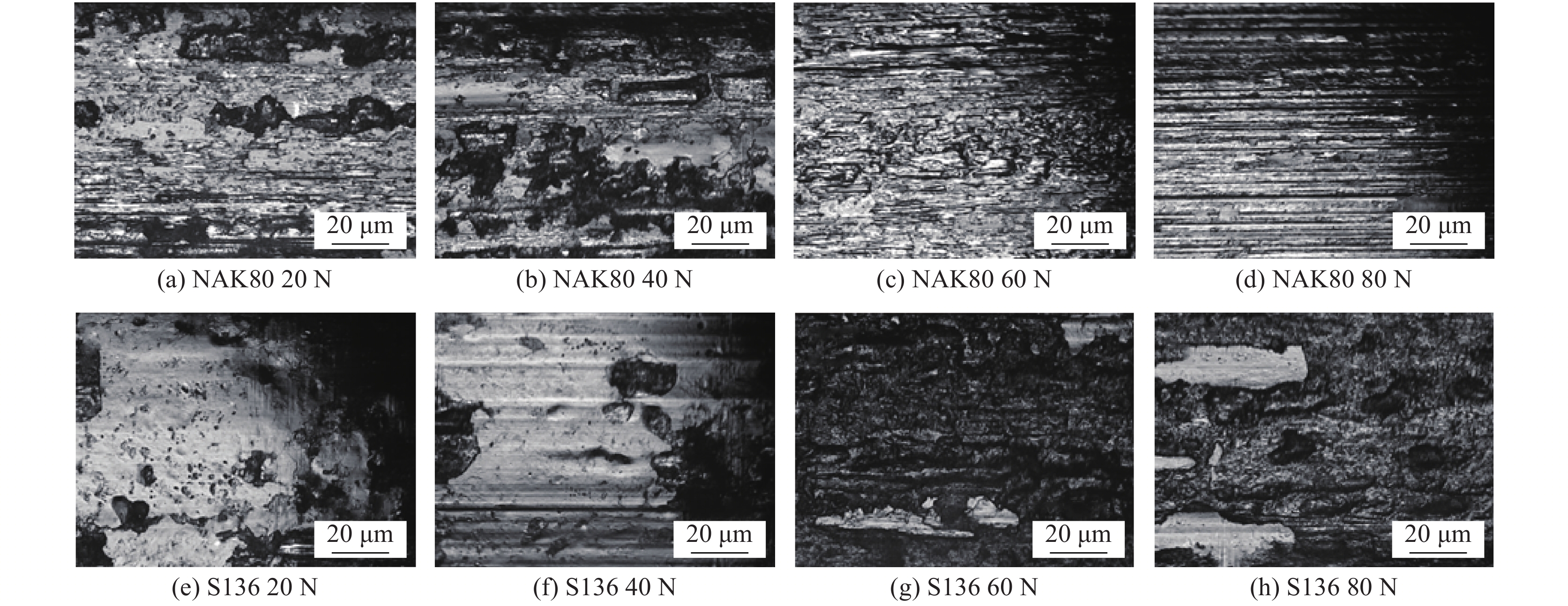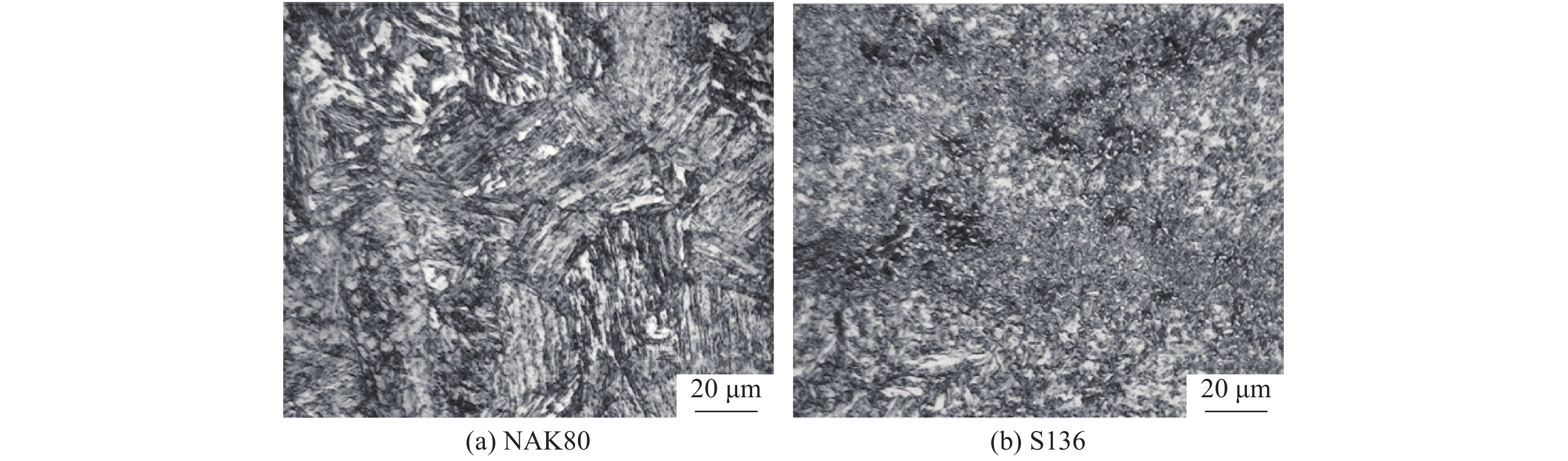The microhardness, microstructure, friction and wear behavior of pre-hardened plastic die steels NAK80 and S136 were studied. The results show that the microstructure of NAK80 steel consists of lath martensite and granular bainite, while that of S136 steel are ferrite matrix and fine carbides, and the microhardness is 405.01 ± 63 HV and 354.21 HV ± 6.14 HV respectively. The friction coefficients of NAK80 and S136 steel decrease with the increase of load. At 60N, the friction coefficients of NAK80 and S136 steel reach their lowest values (0.34 and 0.37). However, when the load increases to 80 N, the friction coefficient increases. Overall, the friction coefficient of S136 is higher than that of NAK80. The wear behavior of NAK80 has high load sensitivity under different load conditions while S136 has more stable wear resistance. At low load, abrasive wear and delamination wear are dominant, and the wear resistance of NAK80 is better than that of S136. At high load, adhesive wear and abrasive wear are dominant, and the wear resistance of S136 steel is better than that of NAK80.