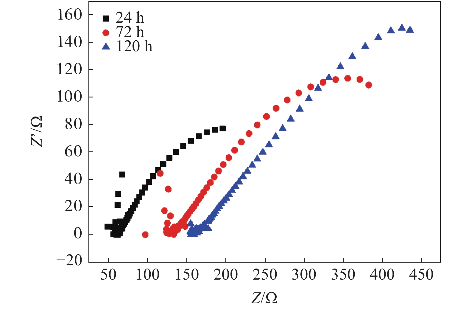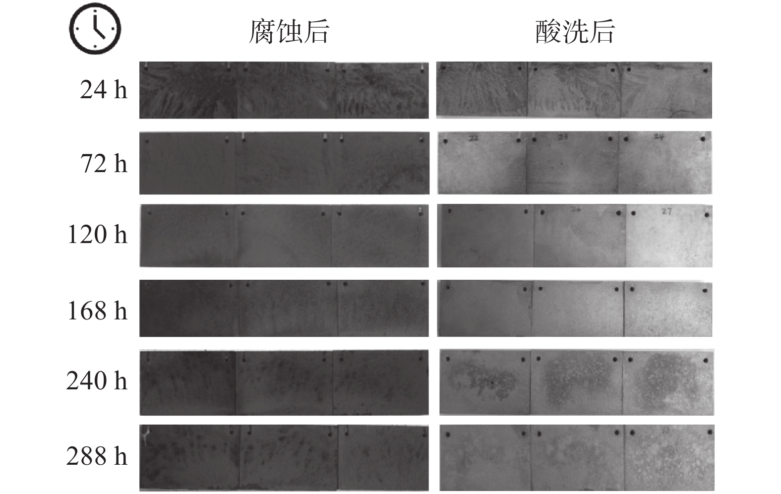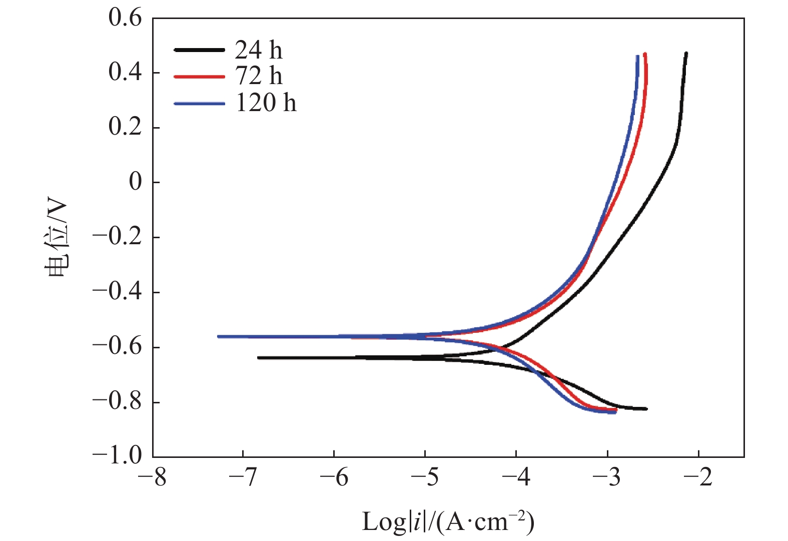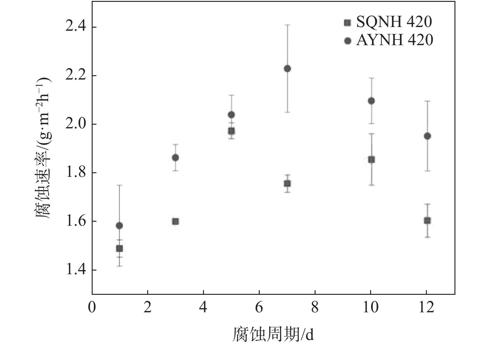 The corrosion behavior of two weathering steels, AYNH 420 and SQNH 420, was studied by using indoor accelerated corrosion tests, XRD analysis, and electrochemical methods. Weightlessness test was used to determine the corrosion rate of the two steels, and the corrosion kinetics of tow steels was studied. The micromorphology and structure of the corrosion products were characterized. Moreover, the corrosion mechanism of tested steels was studied by potentiodynamic polarization and AC impedance spectroscopy. The results indicate that under the same conditions, the corrosion rate of SQNH 420 is lower than that of AYNH 420. The compositions of corrosion products were Fe3O4, α-FeOOH, β-FeOOH and γ-FeOOH, etc. There are two layers in corrosion products, and the inner layer with good adhesion and compact structure plays a protective role. In addition, as the corrosion time increases, the corrosion products increase, and the corrosion tendency of two steels decreases, and the electrode reaction changes from electrode control to diffusion control.