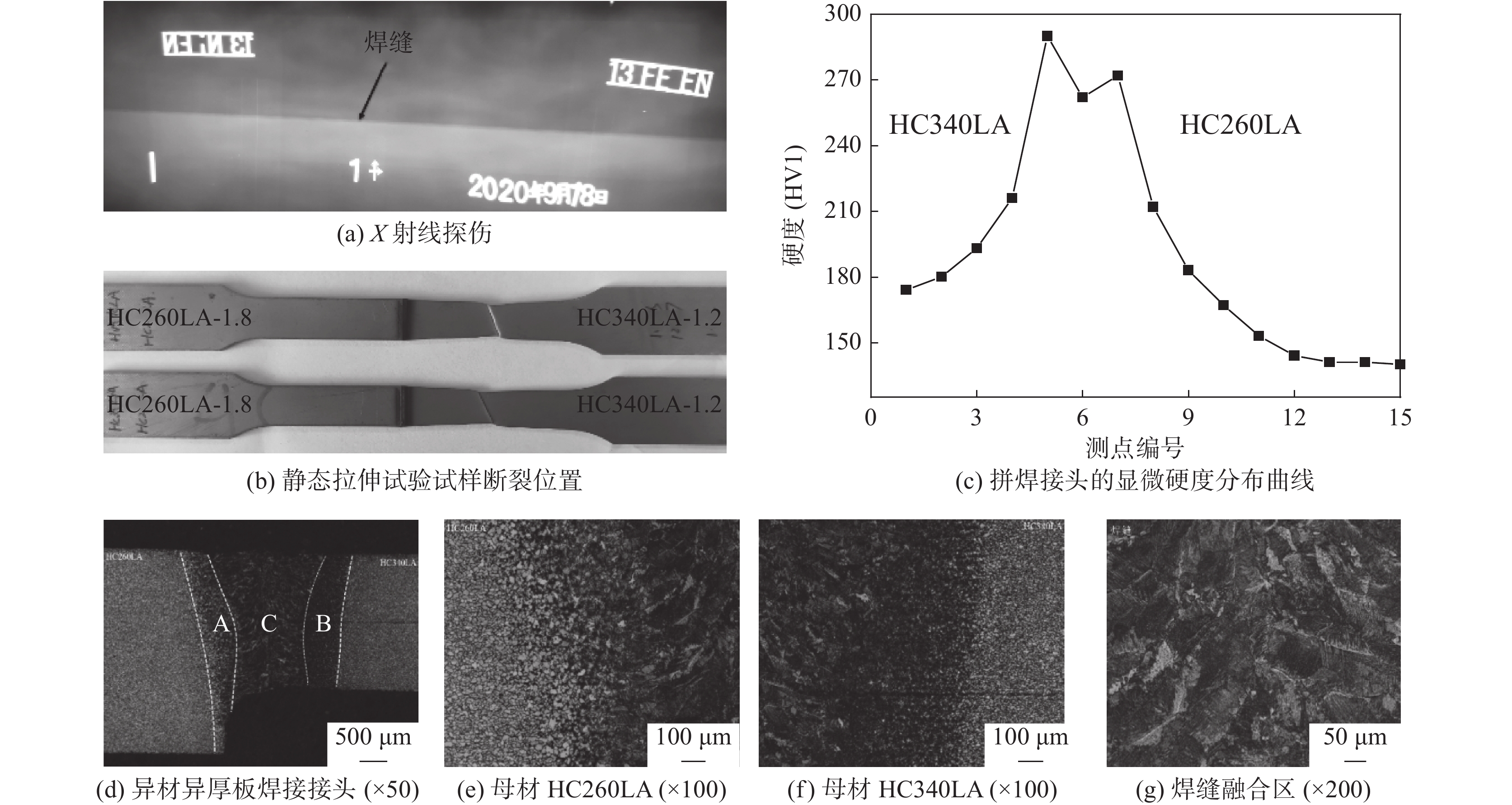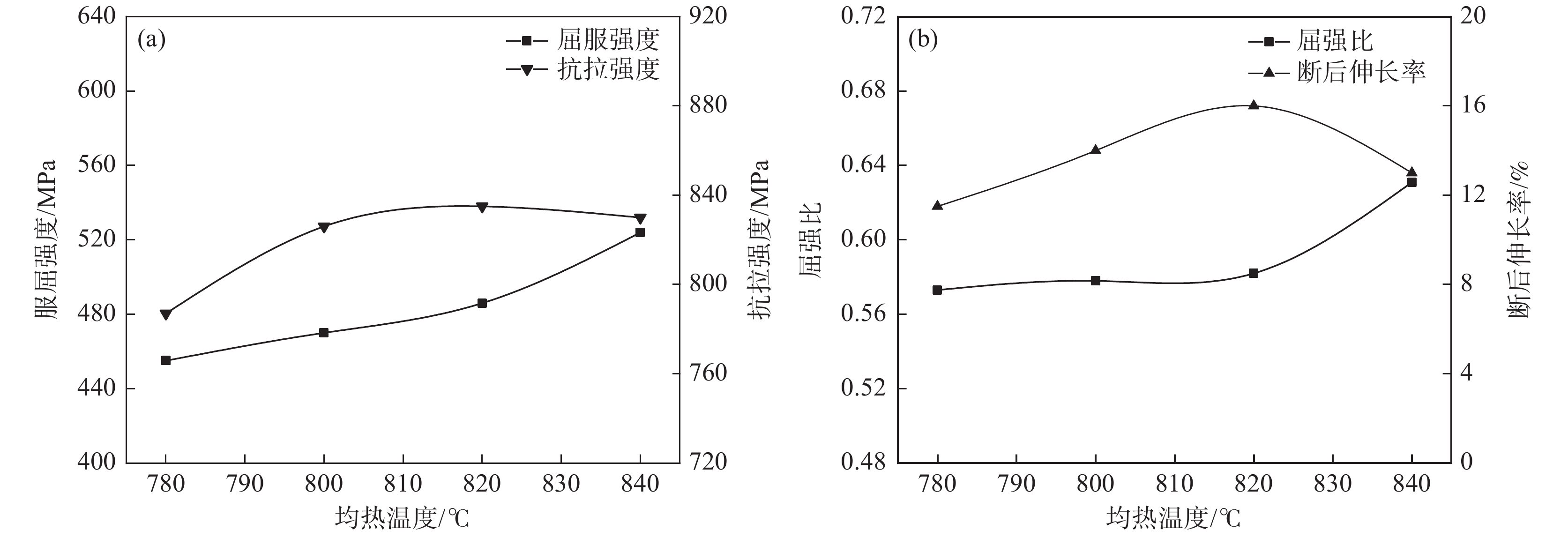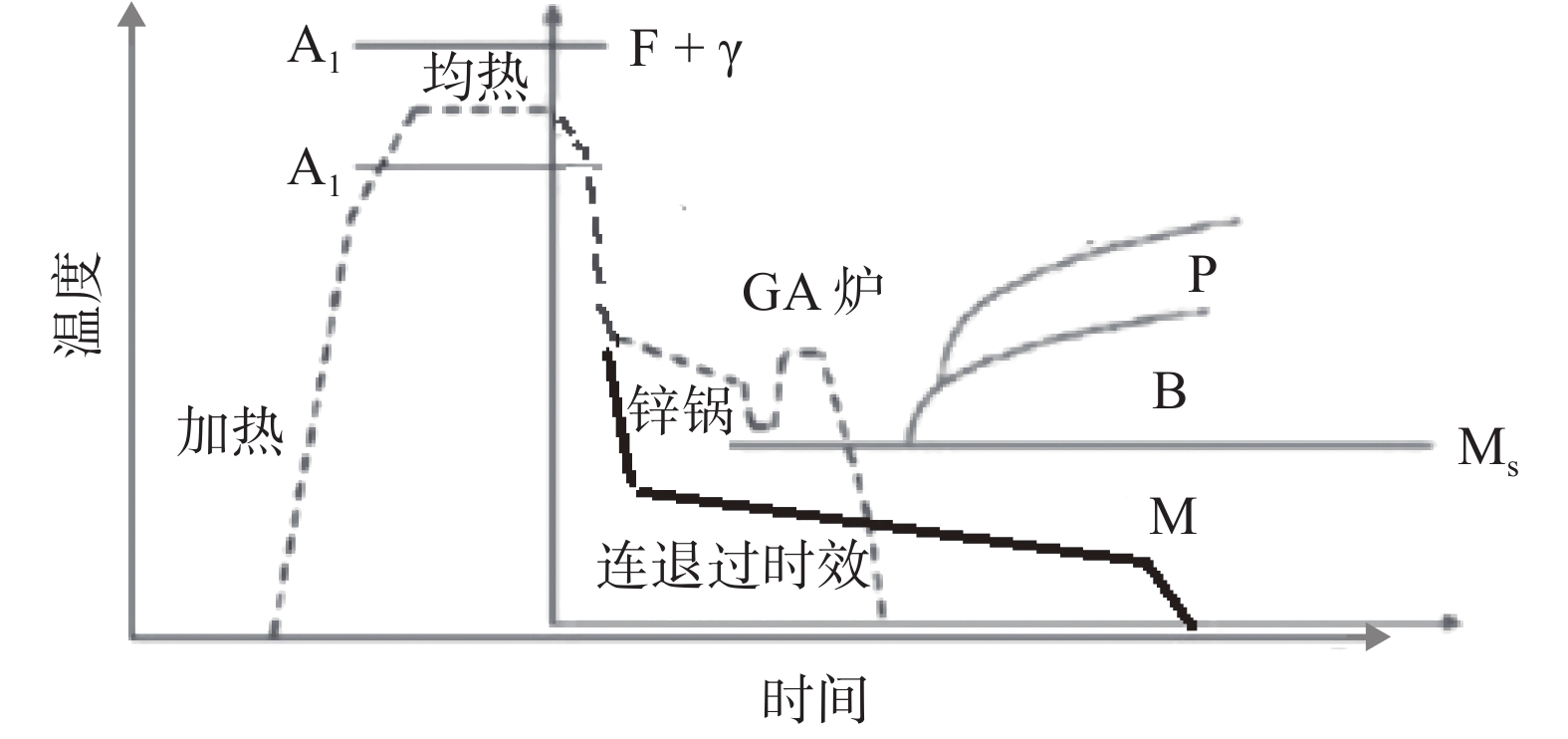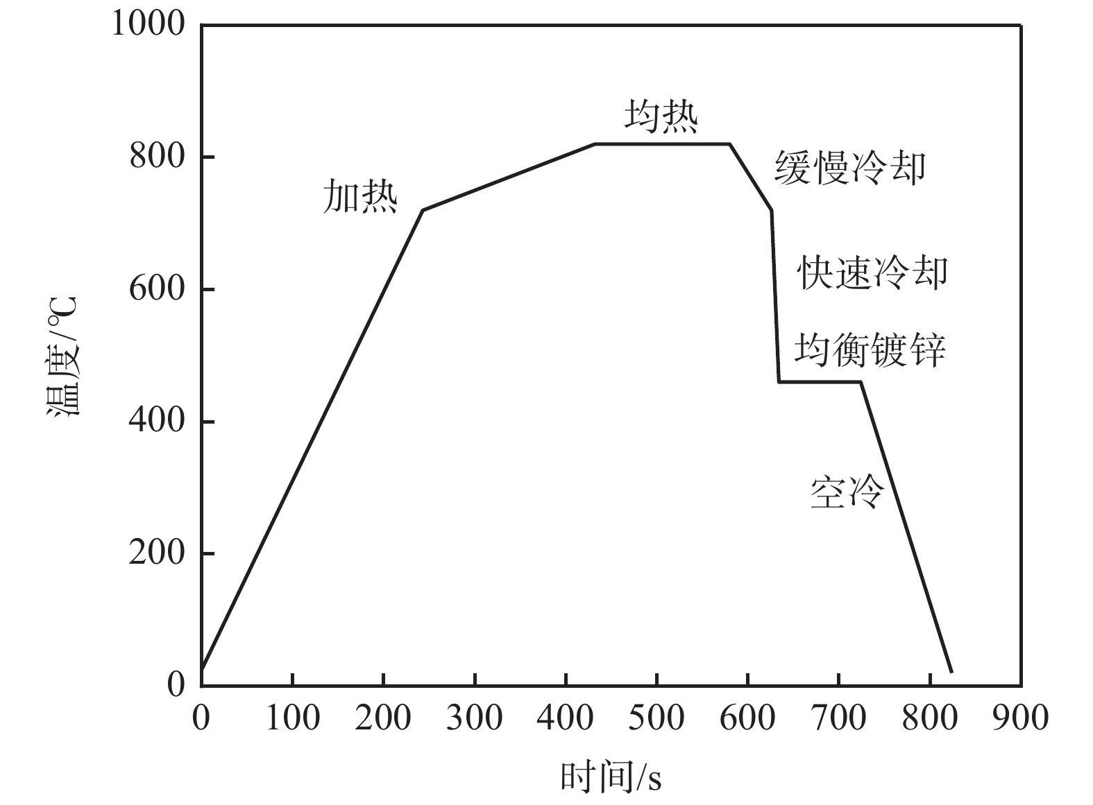 The vanadium microalloyed tested steel was heated to 780 ℃, 800 ℃, 820 ℃ and 840 ℃, respectively and then held for a few minutes, followed by different cooling modes such as slow cooling, rapid cooling, simulated galvanizing, and air cooling to room temperature. Microstructure observation by SEM shows that microstructure uniformity is poor during annealing at 780 ℃ and undissolved carbides are found, leading to a weak combination of strength and plasticity. With the increase of annealing temperature, the size and fraction of ferrite gradually decrease, the volume fraction of mid-low temperature transformation products gradually increases and its size becomes coarser. When the annealing temperature was 800 ℃, the fraction of martensite reaches the maximum. When the annealing temperature further increases, the fraction of martensite decreases, while the fraction of bainite increases, resulting in a relatively stable tensile strength when annealing temperature of 800 ~840 ℃ range, however, the elongation firstly increases and then decreases. When the annealing temperature was 820 ℃, the steel strip obtains better mechanical properties. The yield strength, tensile strength, yield ratio, elongation after fracture A80 and hole expansion rate are 486 MPa, 835 MPa, 0.58, 16.0% and 27%, respectively.