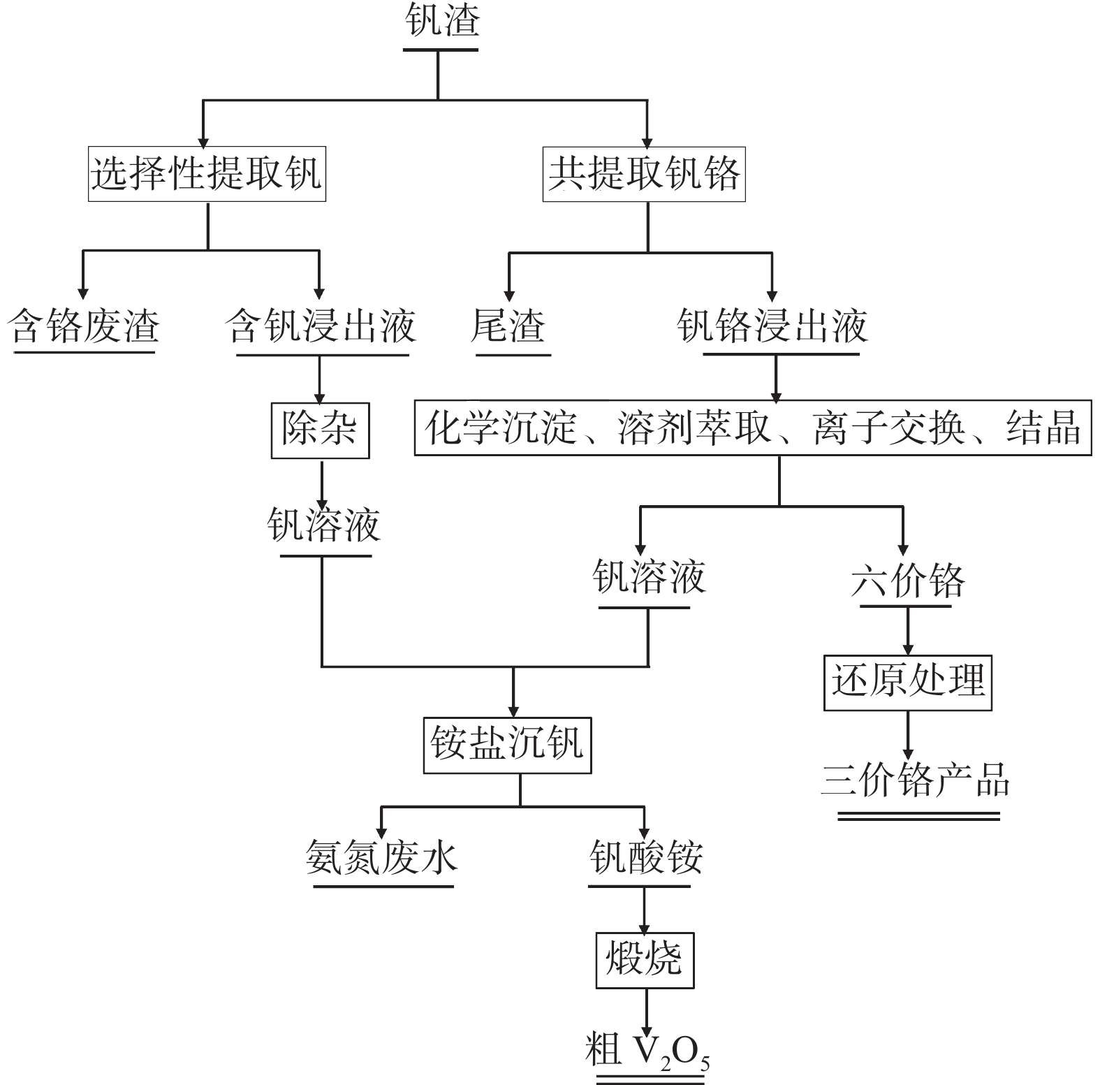 Vanadium and chromium commonly coexist in nature as associated minerals in vanadium-titanium magnetite, which presents a significant technical challenge for their efficient separation during resource extraction. In light of this issue, several commonly employed vanadium and chromium separation techniques in current vanadium extraction processes, such as chemical precipitation, ion exchange, and solvent extraction, have been systematically analyzed in terms of their advantages and existing problems during application. It was emphasized that the development of more efficient and economical vanadium and chromium separation methods remains a key focus of current research. Furthermore, future vanadium and chromium separation technologies should prioritize the research and application of environmentally friendly techniques to address the environmental issues, such as wastewater and waste residue, generated during the separation process, thereby enabling efficient, green, and sustainable production.