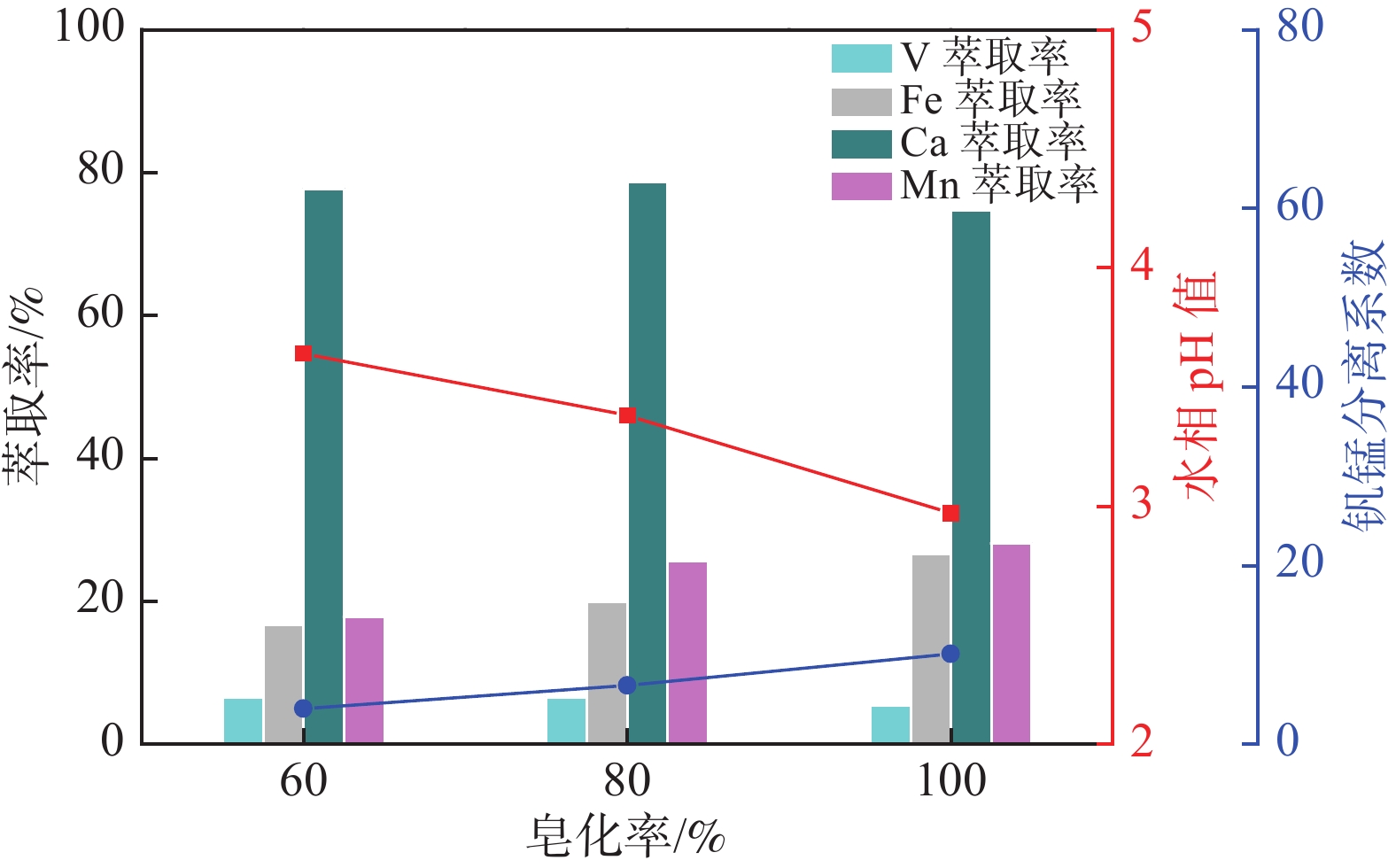 The acidic calcified vanadium solution from Pangang Xichang Vanadium Plant was the research object in this study. In response to its characteristics of low acidity, high vanadium content, and difficulty in impurities removal, an extraction process was adopted to specifically remove Mn2+, Ca2+ and Fe3+ cations. The main influencing factors of the extraction process were investigated. And the optimal extraction parameters were determined. The organic phase ratio was 20% P204+80% 260# solvent oil with a saponification rate of 100% using ammonium hydroxide. The extractant ratio was O/A=2:1 at the initial pH of vanadium solution of 2.9 for 5 minutes. Under the above conditions, the single stage extraction rate of Mn and Ca reach over 98%. After extraction, the Mn content drops to around 0.05 g/L, Ca, Fe and Al leves are below 0.1 g/L in acidic vanadium solution.