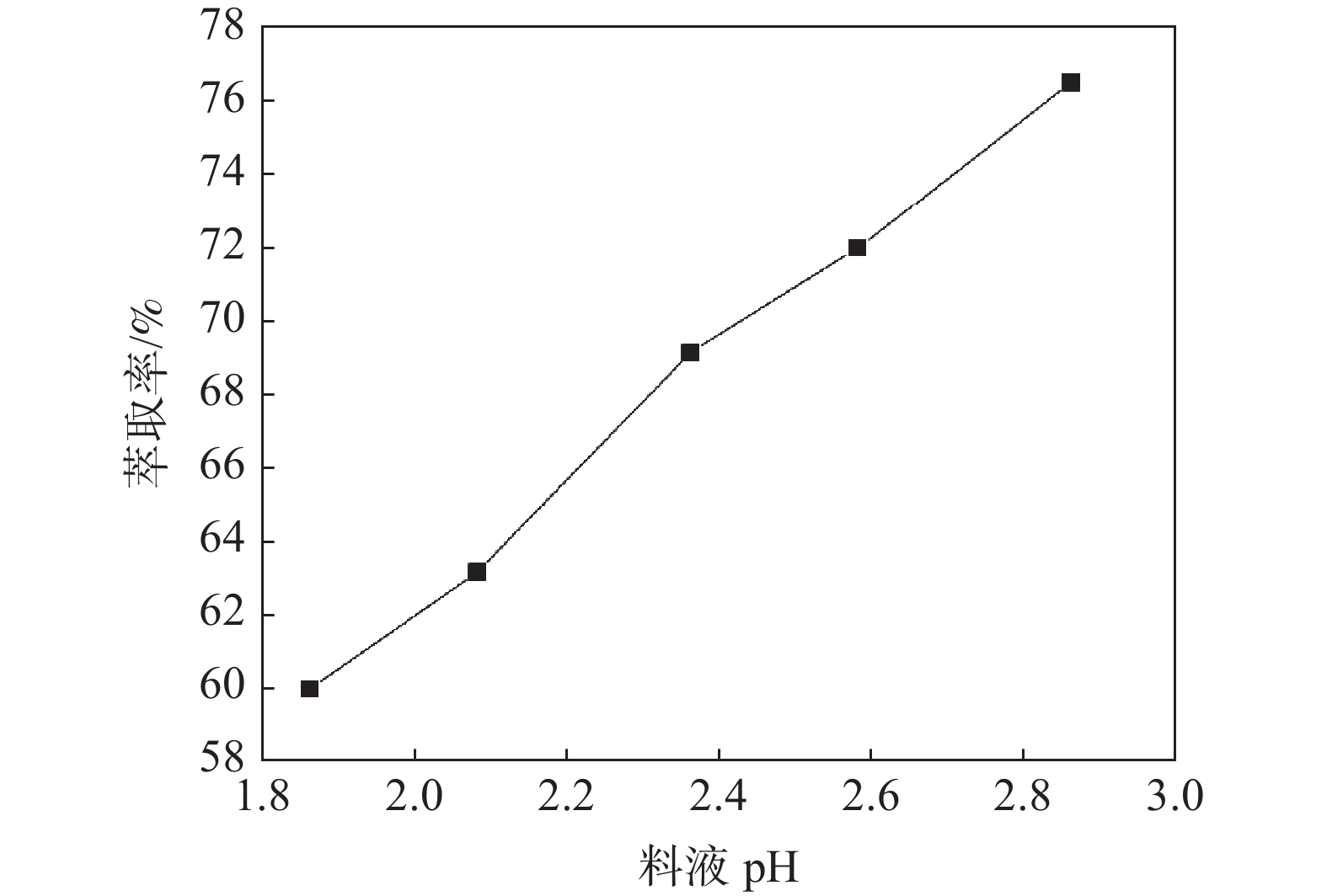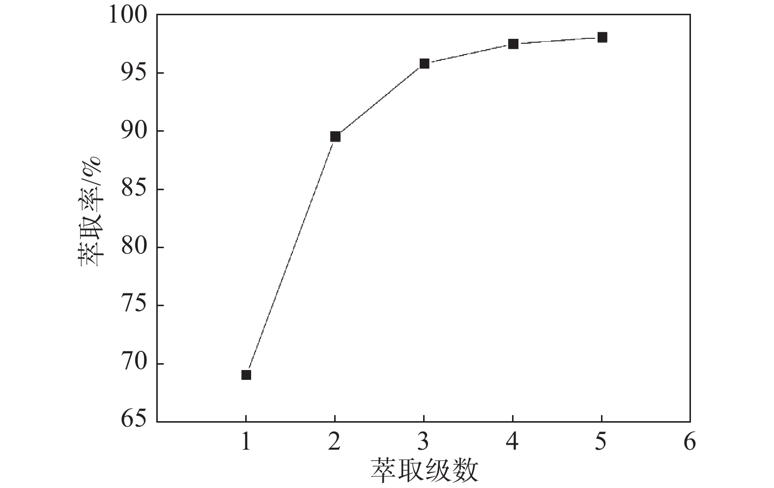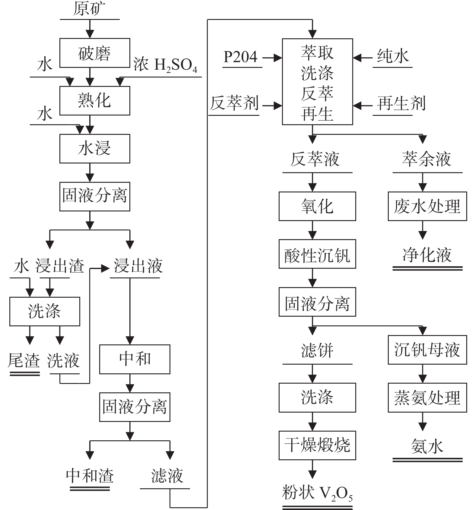 In view of the increasing environmental protection and energy saving requirements of vanadium extraction from stone coal year by year, a clean process for V2O5 extraction by atmospheric pressure wet method including water leaching, extraction separation, vanadium precipitation and calcination was developed. A stone coal mine in Yueyang, Hunan Province was used as raw materials in this paper. Using insulated humidity-concentrated H2SO4 maturation leaching treatment, and also investigated the whole process of extraction, back-extraction and product preparation. The test results show that the vanadium leaching rate can reach 87.8% under the following conditions: 98.3% of mineral size under 100 μm, 10% of water mixing, 18% of acid dosage, maturation temperature of 120 ℃, maturation time of 8 h, water leaching liquid-solid ratio of 2:1 and stirring leaching for 2 h at room temperature. With P204 extraction, the vanadium extraction rate was 98% after 5 single-stage extraction at pH=2.2, and the back-extraction rate of 4 stages could reach more than 99%. At the pH of 1.0 for vanadium precipitation and then multi-vanadate was calcined at 600 ℃ for 2 h, required V2O5 product met the requirements of national standards.