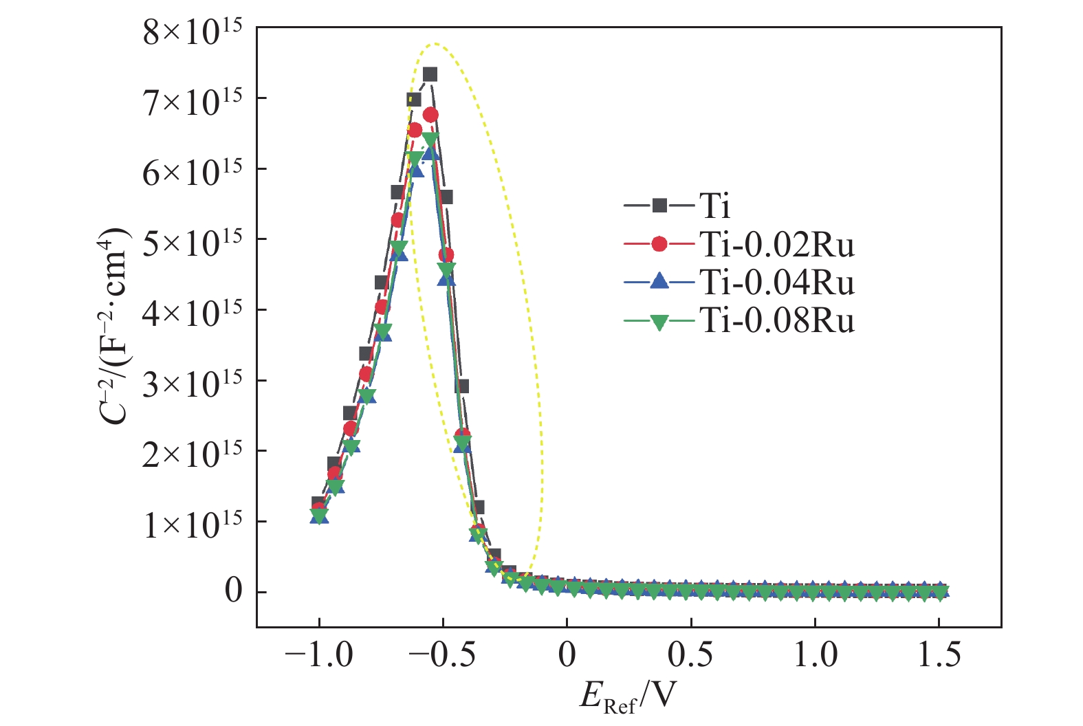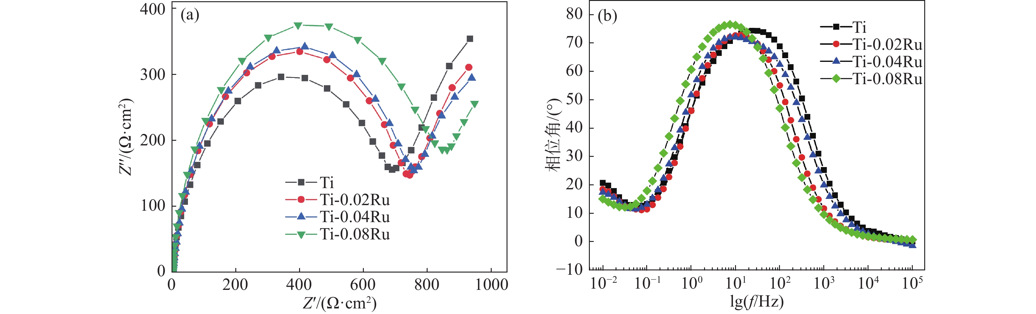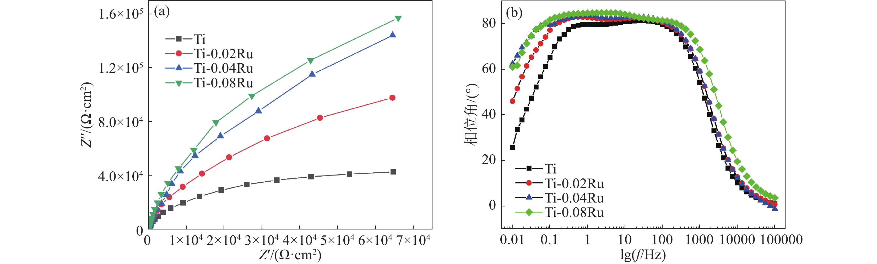 The effect of pure Ti alloyed with different Ru content on the microstructure and electrochemical behaviour was studied for the need of further improvement in corrosion resistance and conductivity of titanium bipolar plates in proton exchange membrane water electrolysis environments. Results indicated that the α-Ti equiaxed grains were refined, the corrosion resistance was improved with the increase of Ru content. The Warburg impedance appeared in the low frequency region of impedance spectroscopy obtained at OCP. When the Ru content is below 0.08%, the passivation film formed by polarizing at 0.8 V vs Ref for 6 h exhibits p-type semiconductor behavior, and the conductivity remains constant.