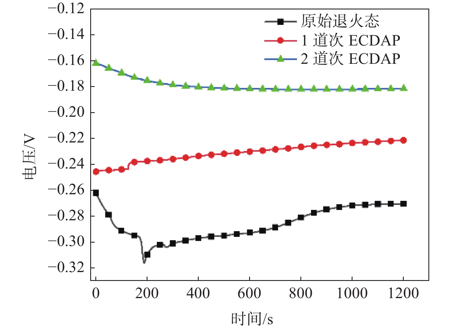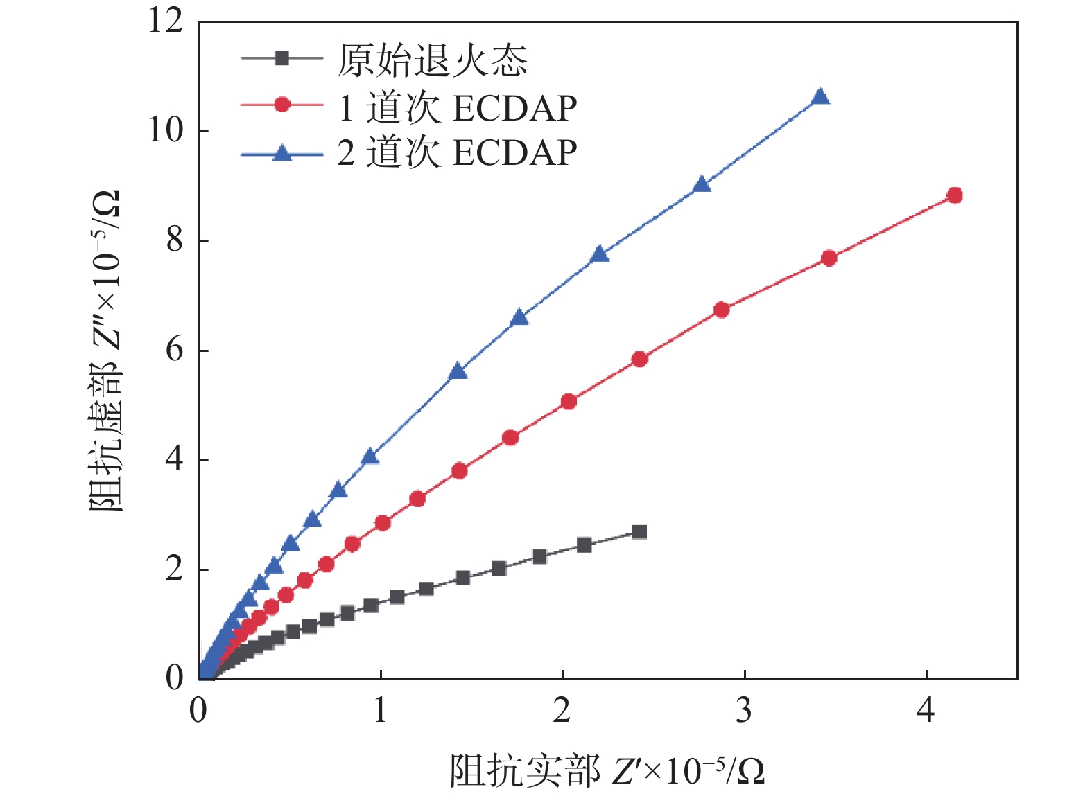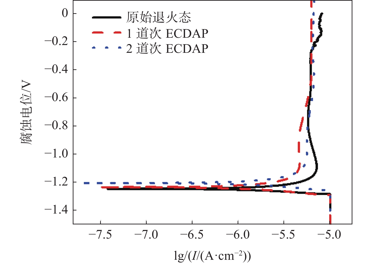 Commercially pure titanium (CP-Ti) was successfully fabricated by 2 passes of equal channel double angular pressing (ECDAP) process under BC route. The electrochemical corrosion behaviors of CP-Ti before and after ECDAP were also tested and analyzed in a 3.5%NaCl solution. The variation laws of circuit potential, dynamic potential polarization curve, and electrochemical impedance were obtained. The microhardness of the deformed specimens was tested and analyzed. The result shows, compared to the original material, the ultra-fine crystalline pure titanium fabricated by ECDAP process has higher microhardness and better corrosion resistance. The microhardness (HV) of the 2-pass deformed sample reaches 157.4 with an increase of 20.6% compared to the original material. The open circuit potential value of the 1-pass deformed sample is higher than that of the original material and lower than that of the 2-pass deformed sample. During the anodizing process, the current of the deformed sample is more stable, and the passivation state is less likely to be destroyed. The polarization resistance results show that the 2-pass deformed sample has the highest polarization resistance, and the sample is less prone to pitting corrosion during the corrosion process. Compared to the deformed samples, the original material has more corrosion pits with larger and deeper sizes on the corrosion surface. The corrosion performance of ECDAP deformed specimens is better than the original annealed sample, and the 2-pass deformed sample shows the best corrosion resistance.