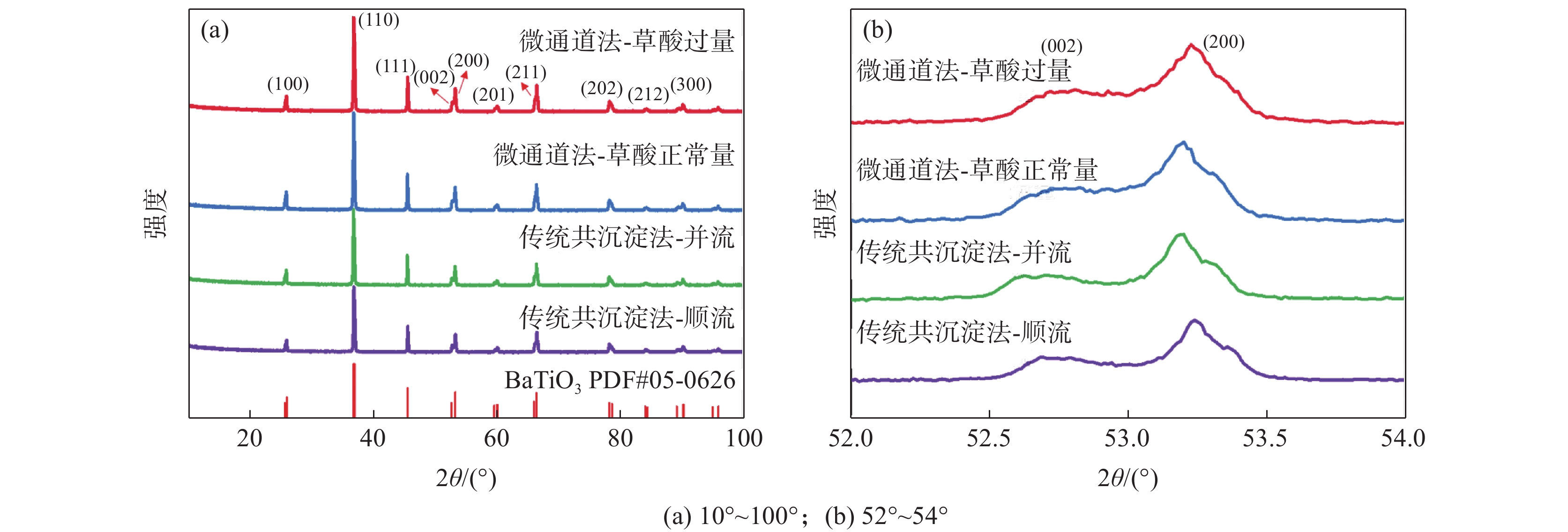 The industrial technologies of tetragonal barium titanate mainly include solid-state method and hydrothermal synthesis method, but there are problems such as large particles, uneven particle size distribution, and low tetragonal phase content. Tetragonal barium titanate was successfully prepared by microchannel synthesis method using barium chloride, titanium chloride, and oxalic acid as raw materials, as well as compared with traditional co-precipitation method. The results of XRD, SEM and TEM indicate that the product is a high-purity, small particle size, and uniformly distributed tetragonal barium titanate, with an average particle size of 110 nm and a particle size distribution range of ± 16 nm. This method with simple synthesis process is easy to achieve mass production and lays the industrial production of high-purity and small-sized tetragonal barium titanate.