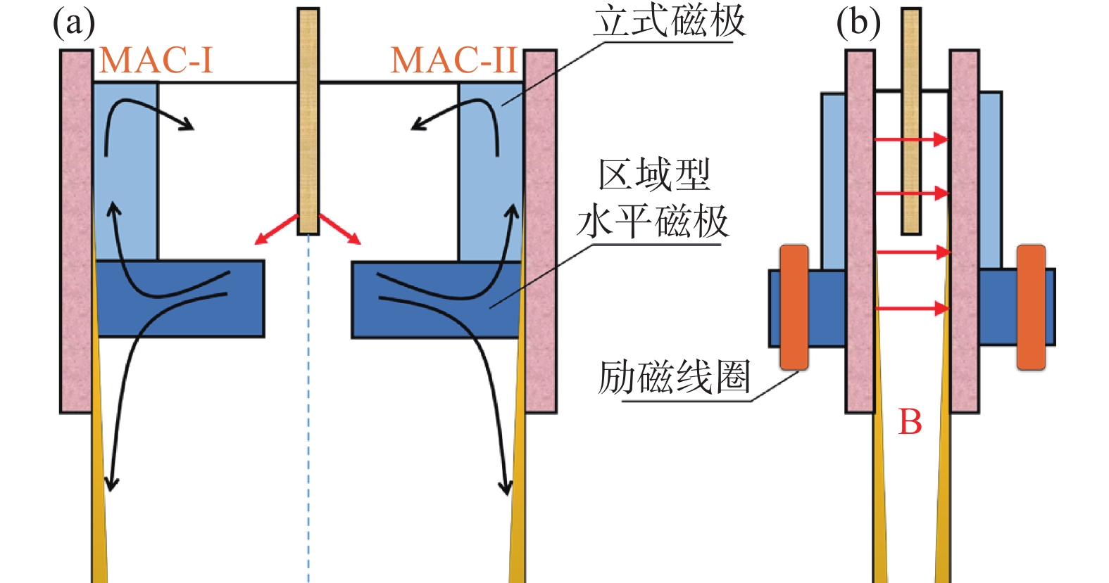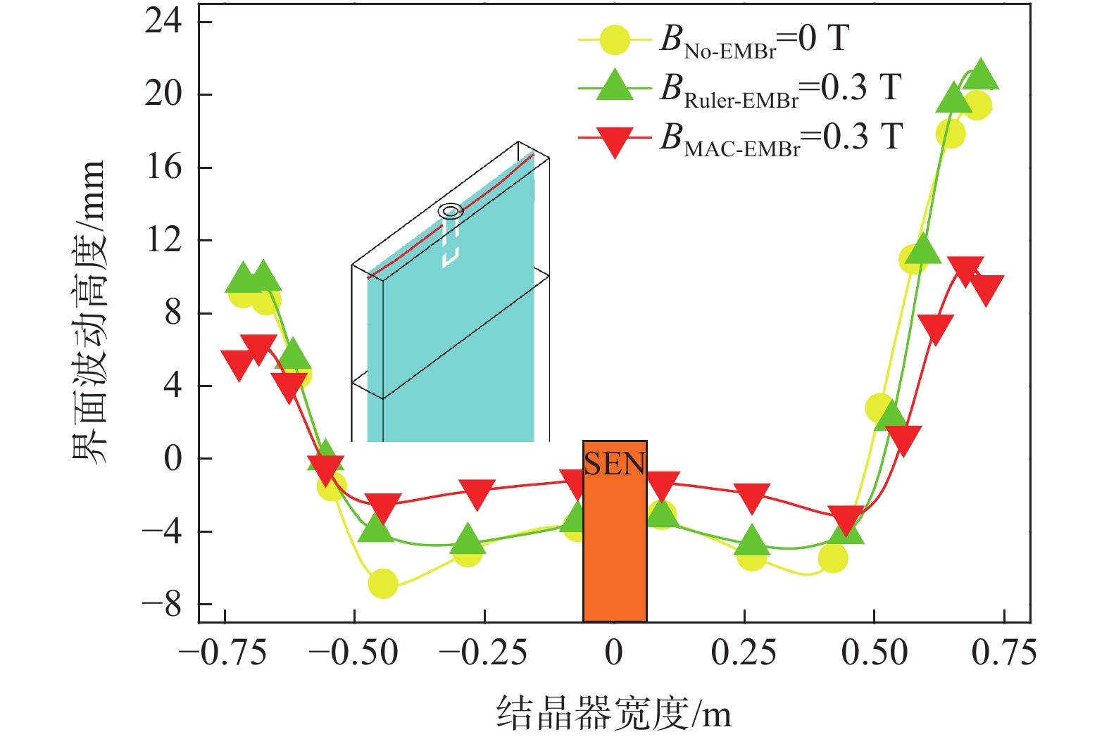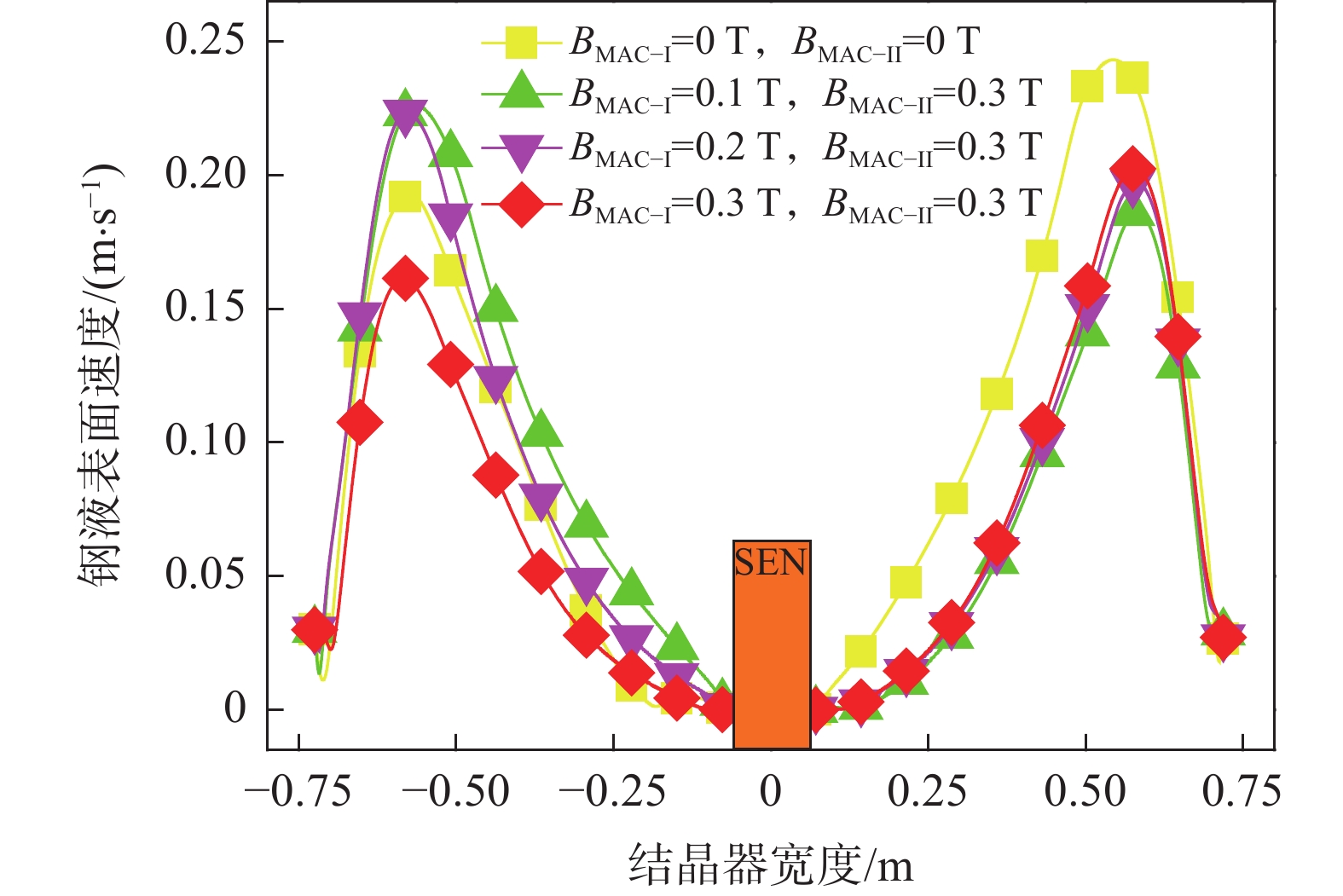 In the process of continuous casting, the distortion of molten steel flow in mold caused by nozzle clogging is a key factor affecting the quality and production efficiency of castings. To solve this problem, a multi area controllable electromagnetic braking (MAC-EMBr) technology is proposed to improve flow state of molten steel and reduce negative impact of nozzle clogging. Firstly, a slab mold is selected as the research object to establish an analytical model of molten steel flow and steel-slag interface behavior in electromagnetic continuous casting mold. Secondly, the fluid-flow-related phenomena of three casting cases in the slab mold, i.e., No-EMBr, Ruler-EMBr, and MAC-EMBr, are further investigated numerically to evaluate the metallurgical capability of the MAC-EMBr, including the non-uniform flow characteristics of molten steel and the evolution pattern of steel-slag interface inside the mold. According to the simulation results, with a 25% blockage rate of a single-side nozzle, the braking effect of the Ruler-EMBr on the backflow in the upper region of the mold is not remarkably. In detail, when the magnetic flux density reaches 0.3 T, the maximum magnitude of the surface velocity and the maximum amplitude of the level fluctuation on non-clogging side with the Ruler-EMBr are 16.7% and 1.6% higher than those with No-EMBr, respectively. This is not conducive to the stability of steel-slag interface in the mold. However, under the same magnetic flux density as the Ruler-EMBr, the application of MAC-EMBr has great potential to suppress the upward backflow on the non-clogging side. In comparison with No-EMBr, the maximum magnitude of the surface velocity and the maximum amplitude of the level fluctuation with the MAC-EMBr are decreased by 16.7% and 48.4%, respectively. As a result, the flow of molten steel in the mold can be well controlled in different regions with the MAC-EMBr, so as to improve the symmetry of the flow field and reduce the flow asymmetry caused by nozzle clogging.