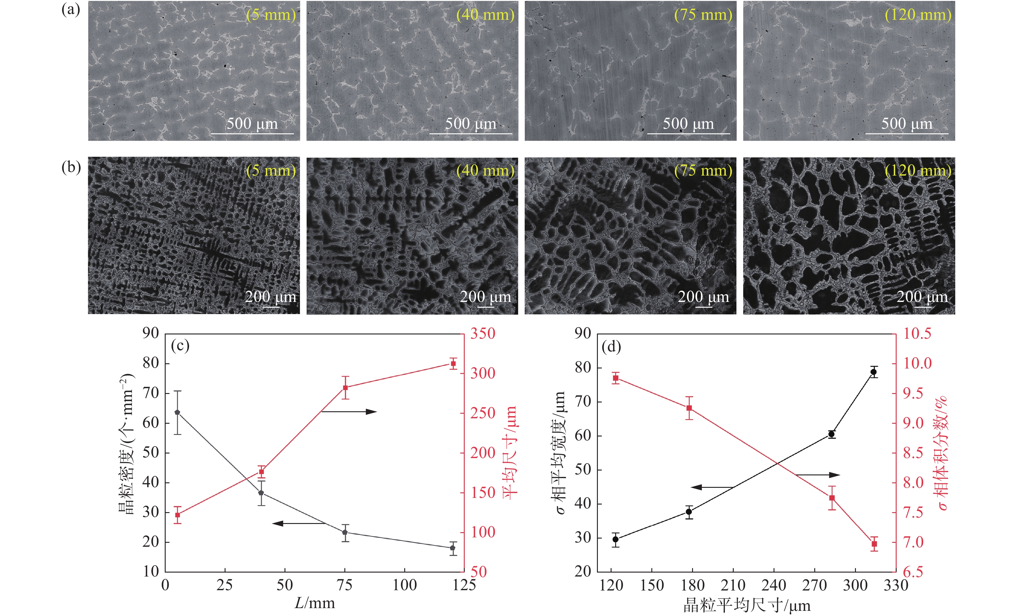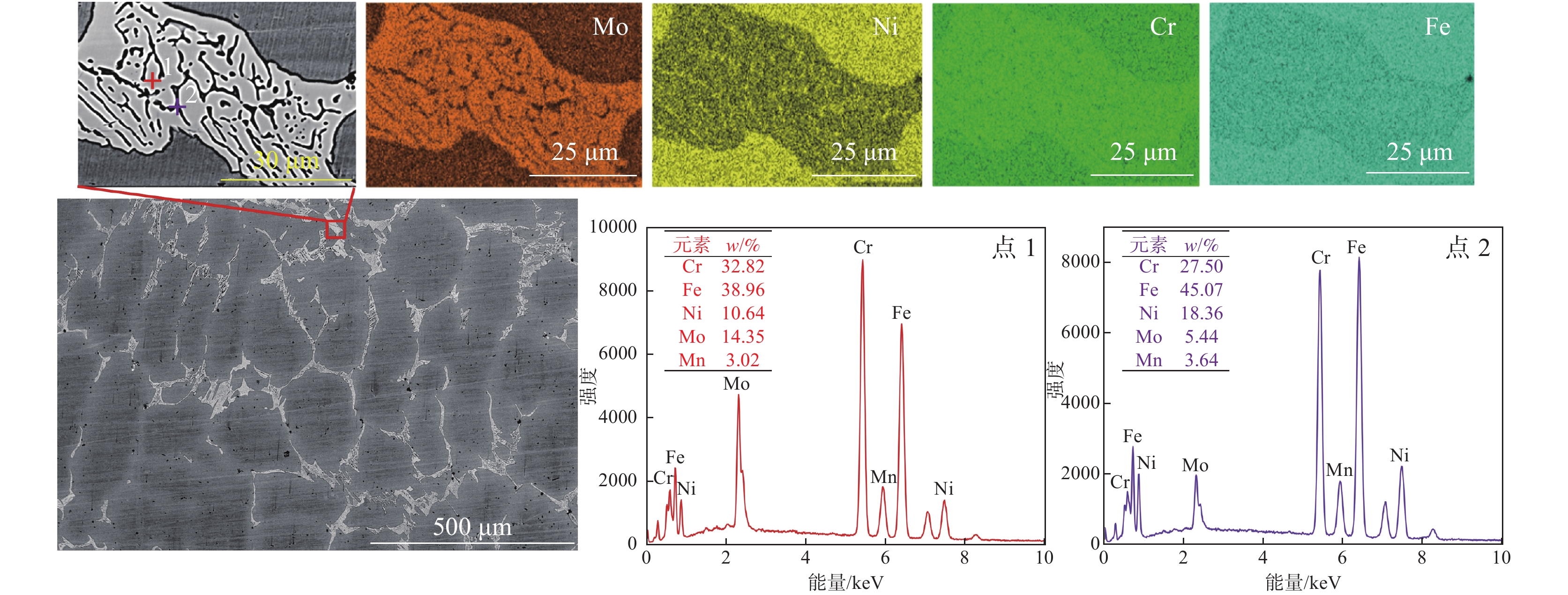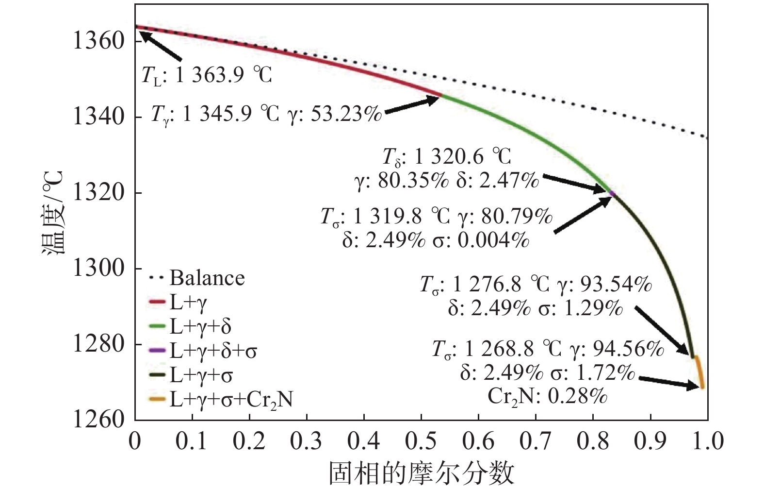 Rare earth Ce treatment is a hot topic in the modification of solidification microstructure for super austenitic stainless steel. In this study, the solidification phase structure, evolution of inclusions, and element segregation behavior of a 500 kg scale Ce-treated 7Mo super austenitic stainless steel were systematically analyzed, for the purpose of providing theoretical basis for Ce treatment of 7Mo super austenitic stainless steel. The results show that the non-equilibrium solidification path of 7Mo super austenitic stainless steel is L→L+γ→L+γ+δ→L+γ+δ+σ→L+γ+σ→L+γ+σ+Cr2N. During cooling and solidification process, an intermediate phase δ phase exists, and the δ phase decomposes into σ phase and γ2 phase at the end of solidification. The main second phase precipitated in the steel is the σ phase rich in Cr and Mo, resulting in a cast solidification structure composed of austenite and σ phase. After Ce treatment in super austenitic stainless steel, the inclusions in the ingot are mainly composite inclusions composed of AlCeO3 and Al11O18Ce, with a low mismatch AlCeO3 structure, which can serve as heterogeneous nucleation cores. During cooling and solidification process, the deoxidation ability of Al is enhanced, and the equilibrium of deoxidation reaction is broken, resulting in the generation of inclusions with Al11O18Ce encapsulating AlCeO3 morphology. The microstructure of the ingot core is coarse, with severe microsegregation between dendrites. The size of micro grains is the key factor affecting the microsegregation between dendrites, and reducing the size of micro solidification structure grains can effectively improve the degree of element segregation inside the grains and then reduce Mo and Cr content in the σ phase between dendrites.
