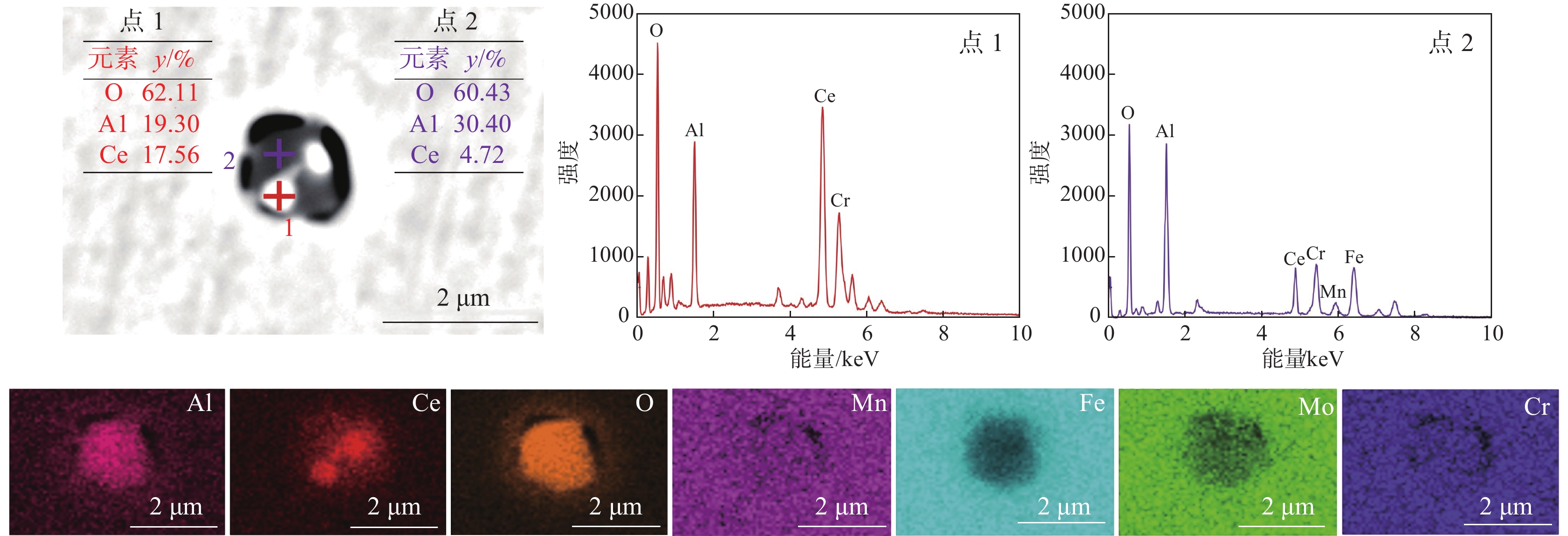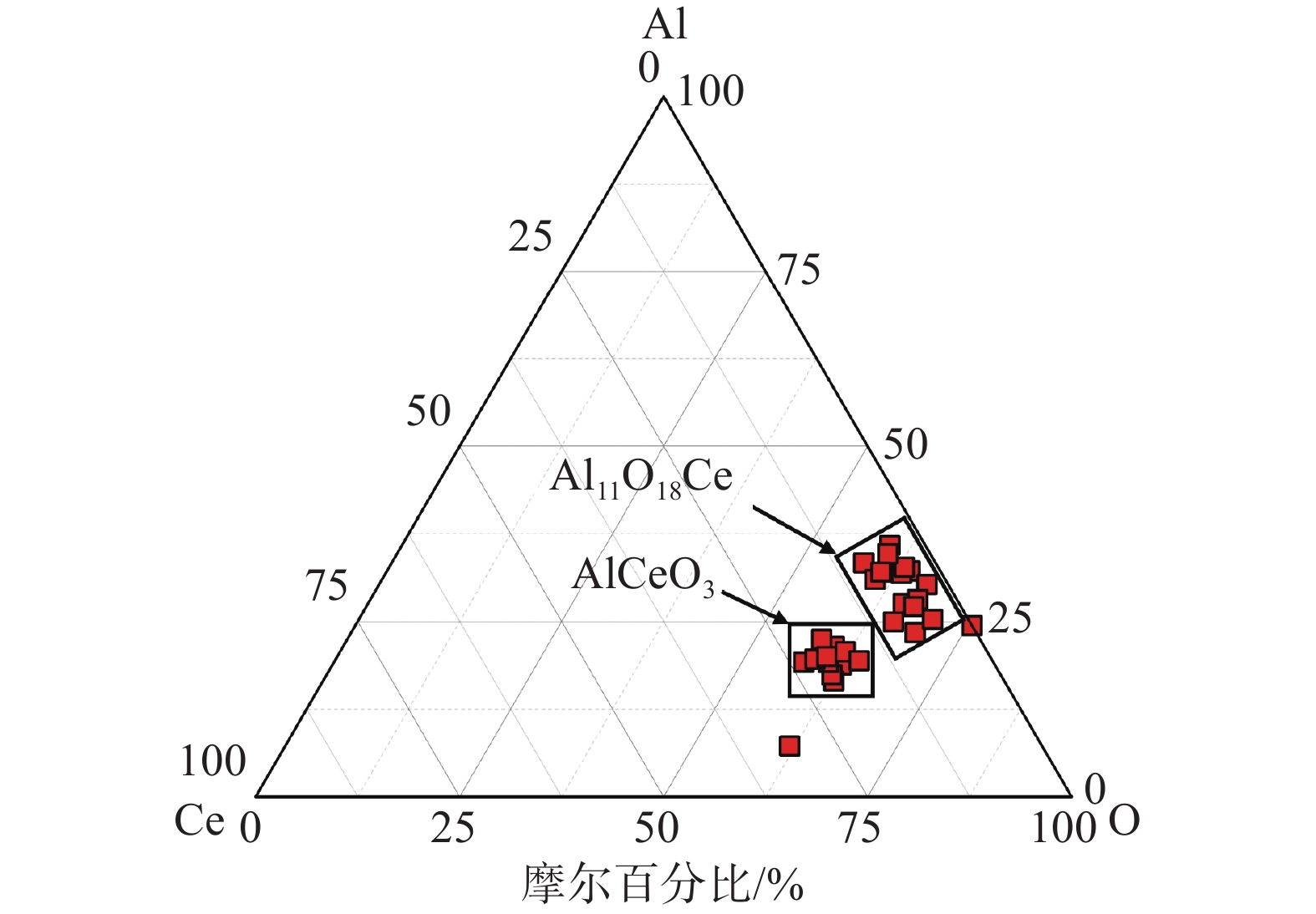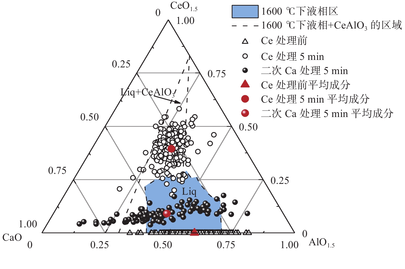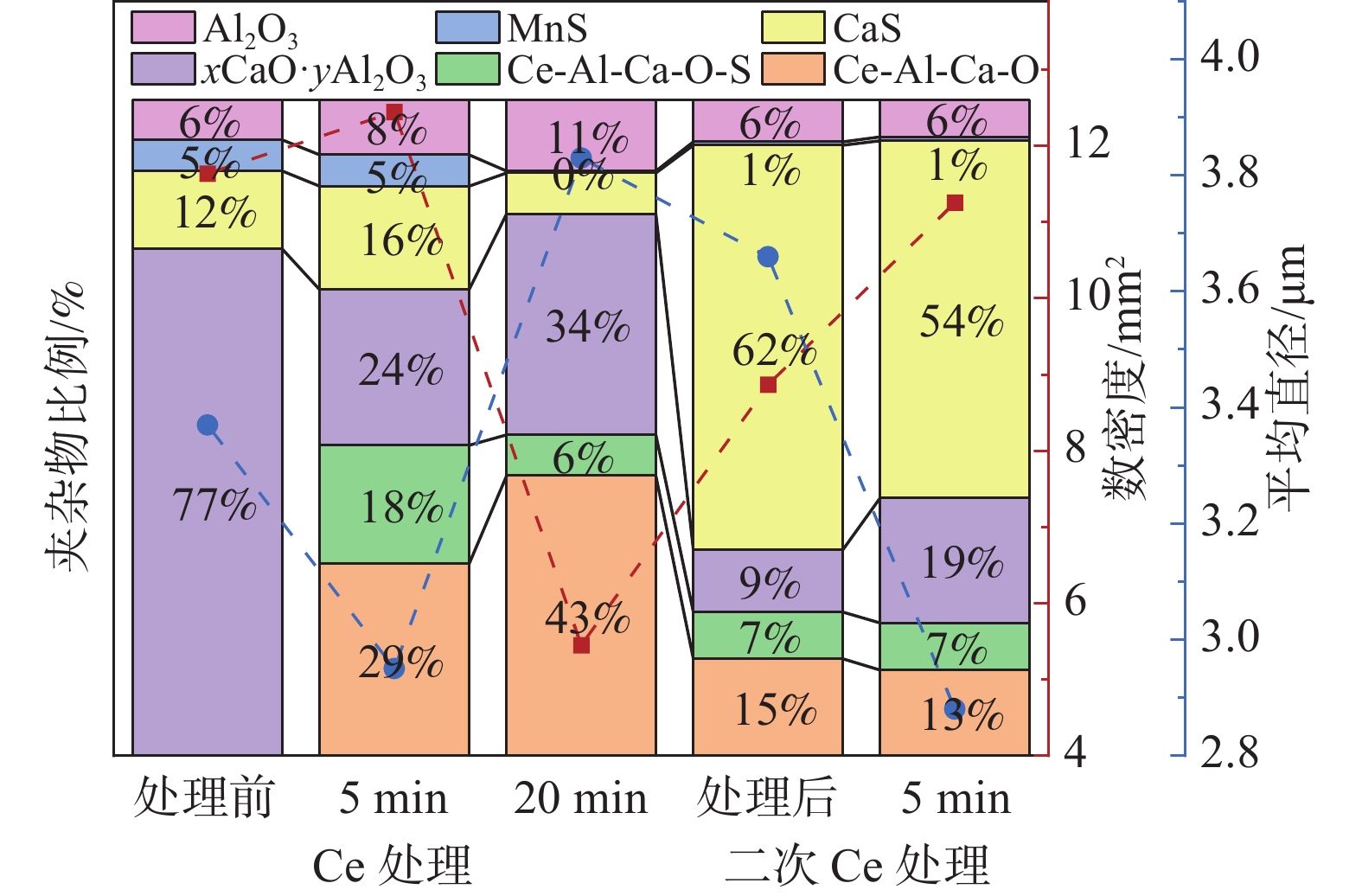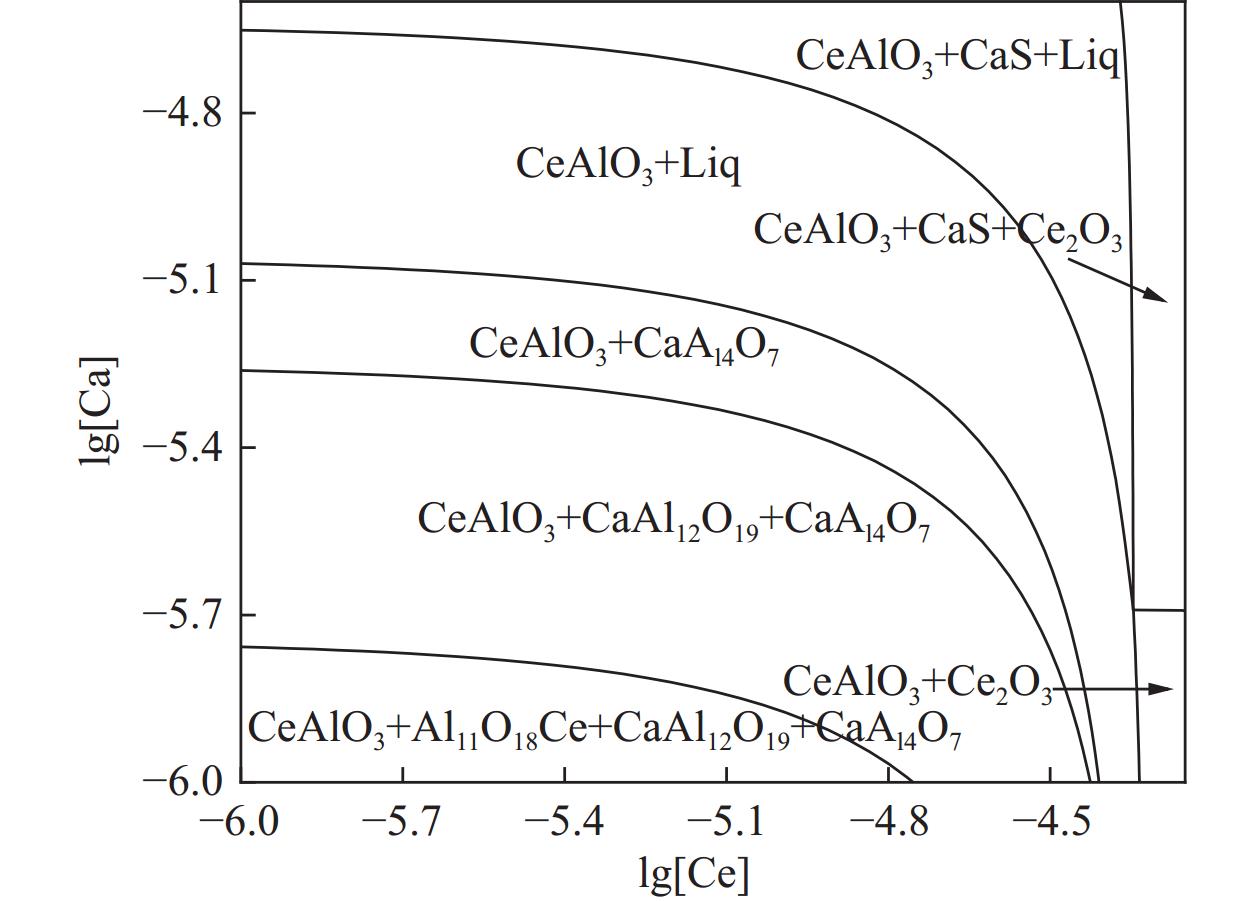 % Ce treatment, the main inclusions in the molten steel are modified from xCaO·yAl2O3 into complex inclusions such as low melting point xCaO·yAl2O3·zCe2O3, CeAlO3+xCaO·yAl2O3, CeAlO3+xCaO·yAl2O3+CaS and low melting point xCaO·yAl2O3·zCe2O3 +CaS. About 53% of the inclusions in the steel were removed after Ce treatment for 20 minutes. [Ce] diffuses into xCaO·yAl2O3 to form low melting point xCaO·yAl2O3·zCe2O3 inclusions in the molten steel. xCaO · yAl2O3 in the molten steel reacts with [Ce] to produce CeAlO3, which in turn generates CeAlO3+xCaO · yAl2O3 inclusions. After the secondary Ca treatment, the Ce inclusion species did not change. Although some of the inclusions were converted into liquid inclusions, the overall number of inclusions increased, and CaS became the dominant inclusion. It indicates that there is a problem of excessive calcium treatment in the current Ce treatment combined with double Ca refining treatment processes.