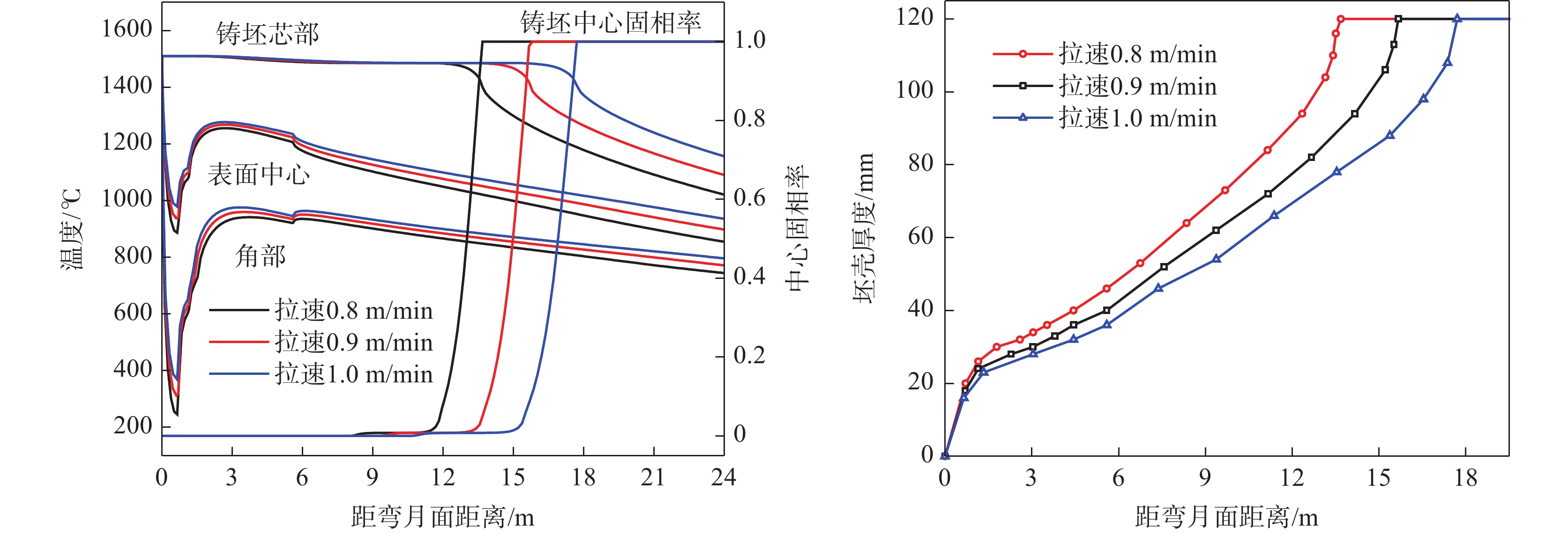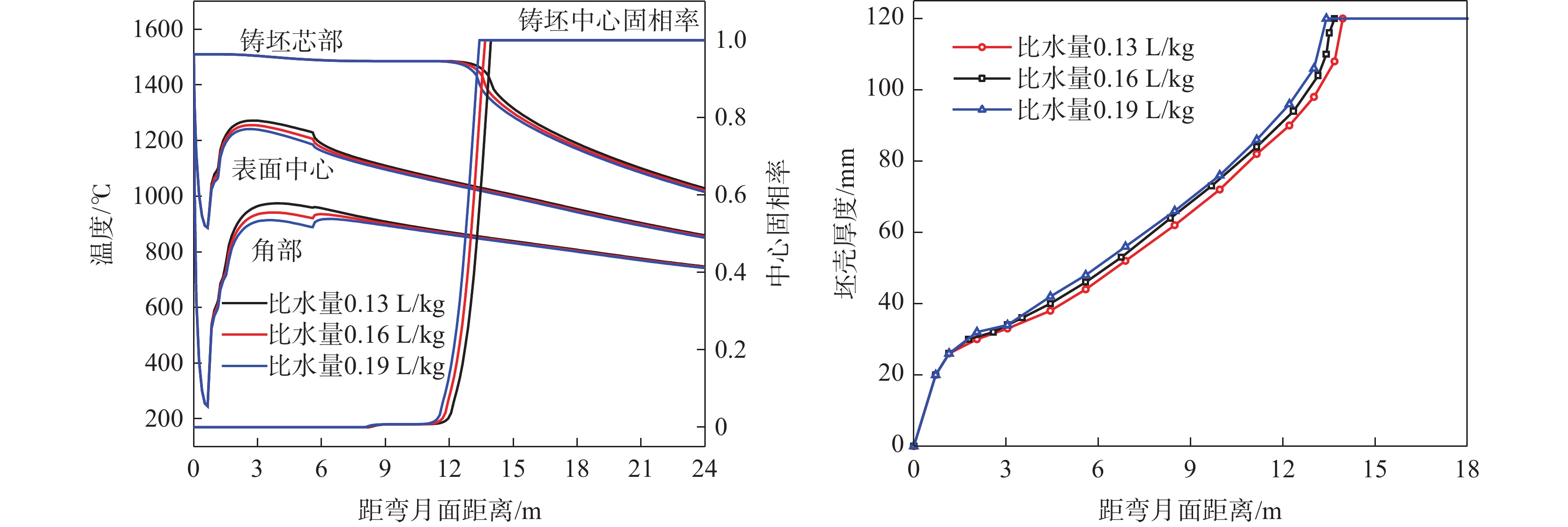 In order to calibrate the solidified end position of the 50CrV spring steel billet with 240 mm×240 mm section and determine the reasonable position of electromagnetic stirring at the solidification end, the nail shooting experiment was carried out on the Xianggang billet continuous caster. The results showed that the comprehensive solidification coefficient of the spring steel billet was 26.8 mm/min1/2. When the casting speed are at 0.8 m/min and 1.0 m/min, respectively, The end positions of solidification are 16.2 m and 19.8 m from the meniscus surface, respectively, and the suitable positions of electromagnetic stirring at the end of solidification are 7.18 m and 8.84 m from the meniscus surface. Based on the verification of the nail test, the solidification heat transfer model was established, and had been used to studied the solidification characteristics of the casting billet under different continuous casting process parameters. The model predication could be used to optimize and correct the existing continuous casting parameters so that the electromagnetic stirring effect at the solidification end could be fully exerted and the central segregation should be reduced, consequently the quality of the casting billet could be improved.