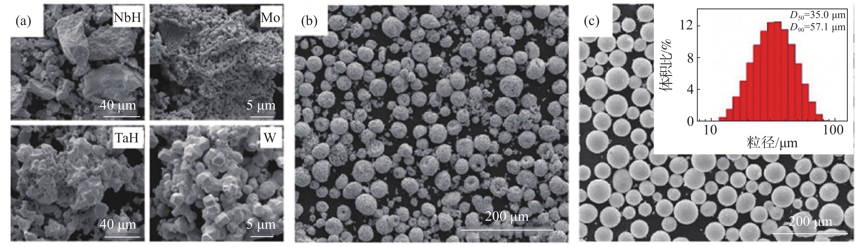 The near-net forming process such as additive manufacturing provides technical paths for the preparation of complex parts of refractory high-entropy alloys, and also puts forward higher performance requirements for their powders. In this paper, the composition design criteria of refractory high-entropy alloys and the effects of various elements on the properties of alloys are reviewed. The main technical routes of powder preparation (mechanical alloying, plasma rotating electrode process and radio frequency plasma spheroidization) are analyzed and compared. In addition, the problems and solutions in the application of refractory high-entropy alloy powder in powder metallurgy, laser cladding, additive manufacturing and other fields had also been discussed.