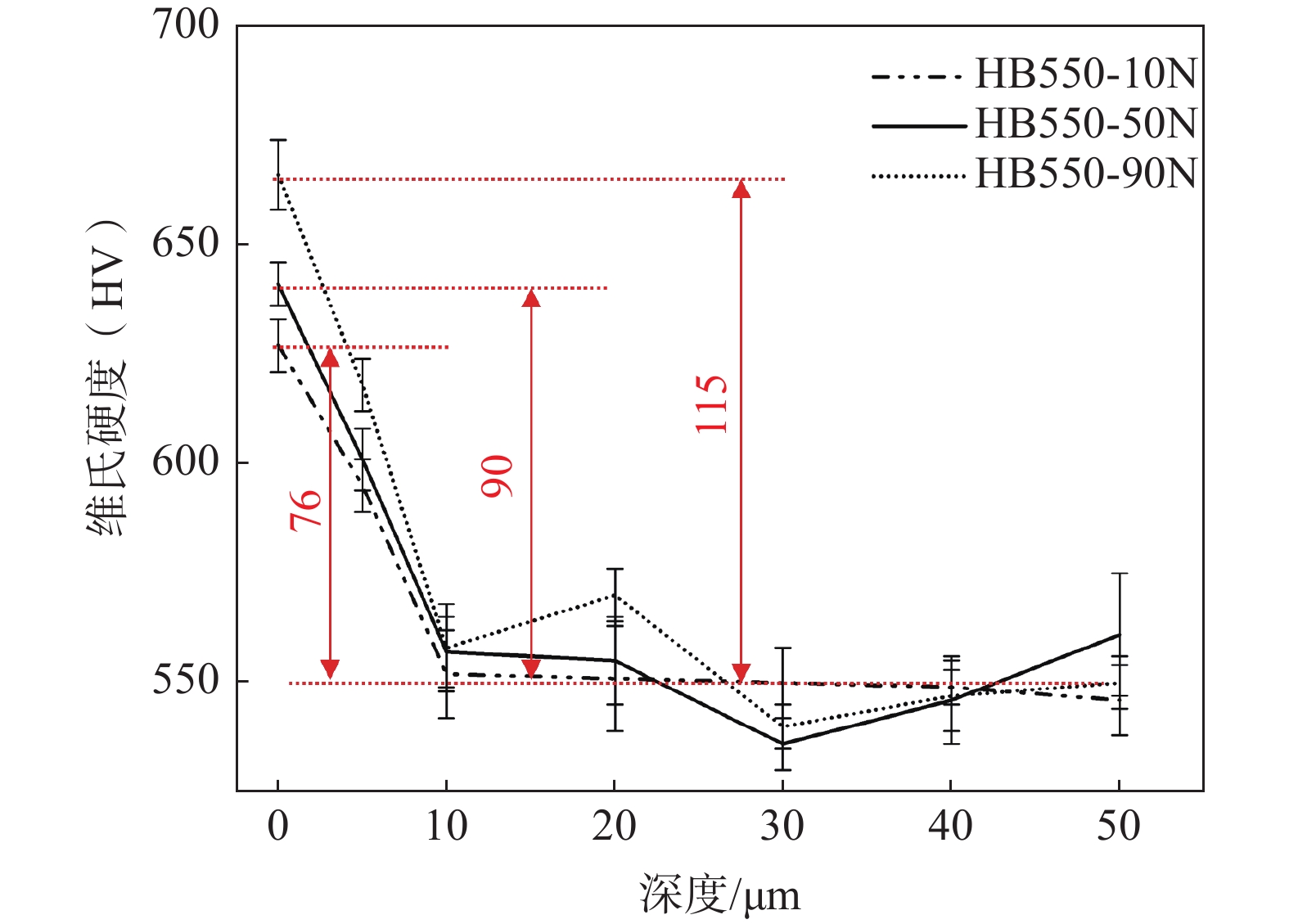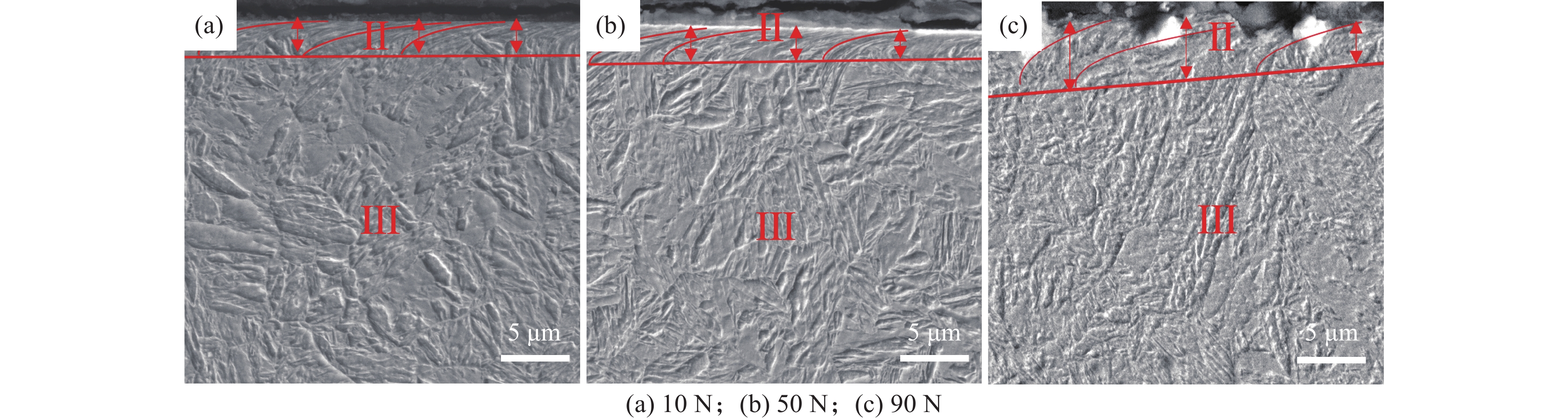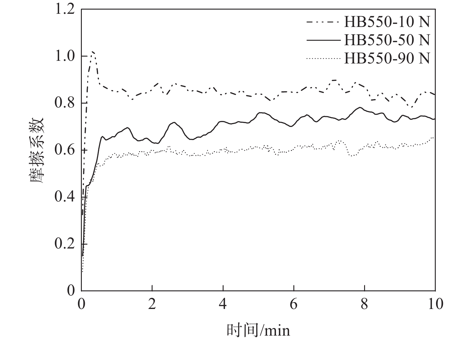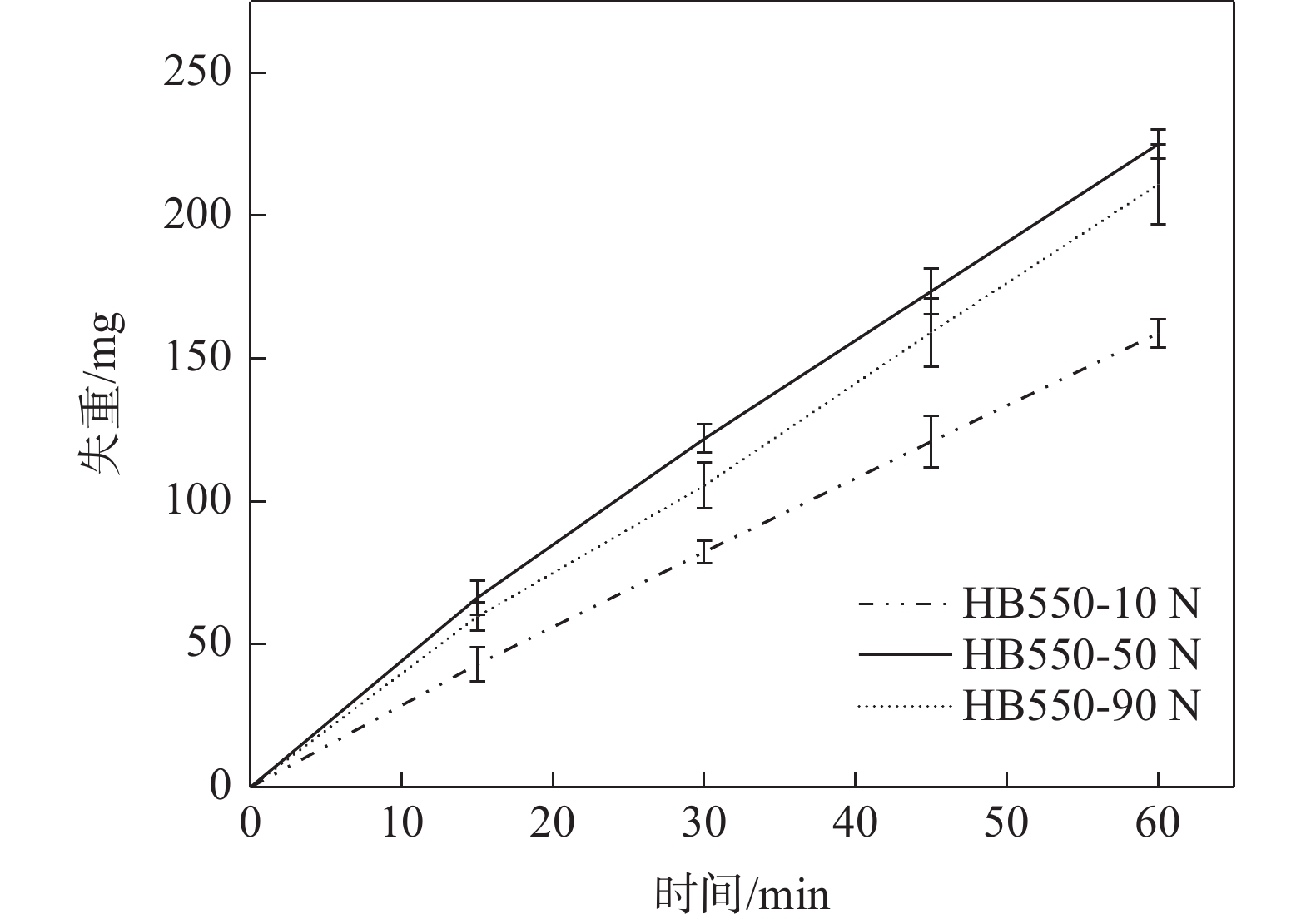The microstructure and mechanical properties of the newly developed HB550 low-alloy high-strength wear-resistant steel were studied through optical microscope, scanning electron microscopy, tensile tests, and Vickers hardness tests. Meanwhile, the sliding wear behavior and the friction coefficient of high grade HB550 martensite wear-resistant steel under the loads of 10, 50 N and 90 N were systematically investigated by ML-100C wear testing machine and BMT-I multifunctional material surface performance tester, respectively. The results show that the microstructure of HB550 low-alloy high-strength wear-resistant steel was mainly tempered martensite. The mean yield strength and tensile strength as well as low temperature impact energy at ?40 ℃ with 5 mm thickness of this steel were 1521 MPa, 1874 MPa and 18 J, respectively. Moreover, with increasing the load, the wear mass loss of HB550 steel increased first and then decreased, while the friction coefficient decreased monotonously. The wear mechanism of the developed steel grade HB550 under lower loads is mainly abrasive wear and adhesive wear, and the wear mechanism under high loads is mainly adhesive wear accompanied by oxidative wear. The research results provide a theoretical basis for the development and application of high-end wear-resistant steel HB550 and above.