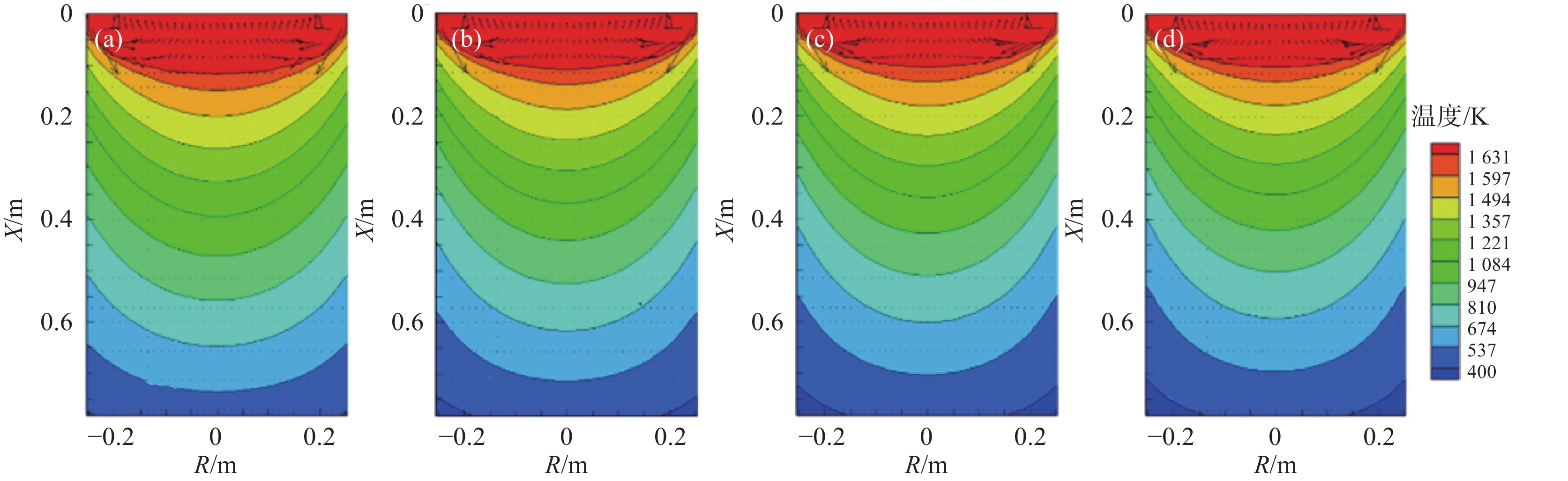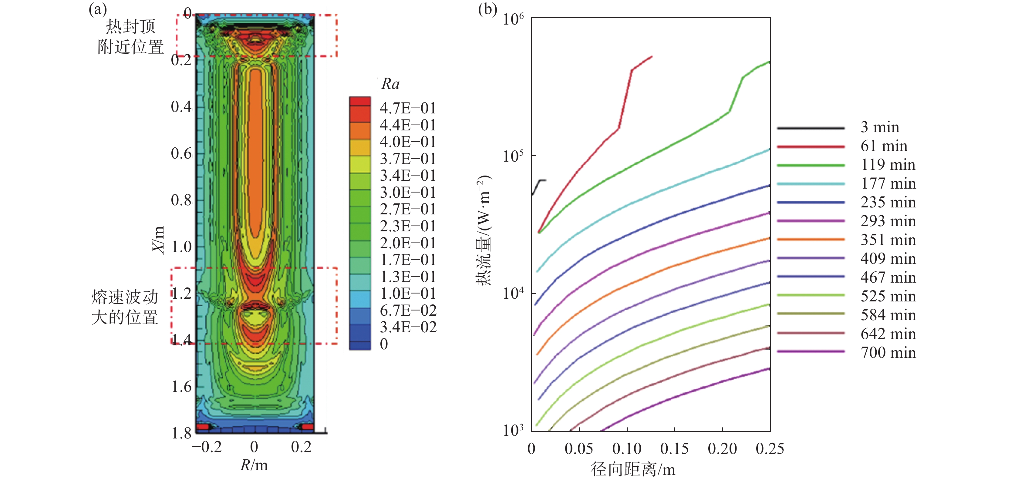 In this paper, the numerical simulation on vacuum arc remelting process of nickel base superalloy with respect to electromagnetic distribution, flow and heat transfer behavior of molten pool, as well as the morphology and size at different stages of the vacuum arc remelting process had been carried out by using a Meltflow-VAR software. Moreover, the formation tendency and reasons for the freckle defects throughout the smelting process had been investigated. At the same time, the influence of helium pressure on the flow and heat transfer behavior of molten pool, the morphology and size of molten pool, and the freckle formation was studied. The results show that the potential is mainly located in the center of the surface of the ingot, while the magnetic induction intensity is mainly located at the edge of the surface of the ingot, as well as the flow of the molten pool is mainly driven by thermal buoyancy. In addition, the electric field strength, current density, Lorentz force as well as the size and flow intensity of the molten pool that distributed on the surface and inside of the ingot, gradually increase at the ignition process of vacuum arc, and remain stable during the steady-state stage, then gradually decrease during the hot tap stage. During the entire smelting process, the freckle defect easily forms near the top of the hot seal on the upper part of the ingot because the cooling effect of the bottom plate of the crystallizer is weak, the helium pressure at the top of the hot seal decreases and the holding time at low melting rates is long as the ingot grows in the longitudinal direction. Increasing helium pressure can reduce the size of the molten pool and alleviate ingot segregation, but the effect of improving ingot segregation defects will gradually become less significant as continuously increasing helium pressure. Finally, the comparison of molten pool depth observed by experimental dissection and simulation is conducted, which verifies the rationality of the established mathematical model.